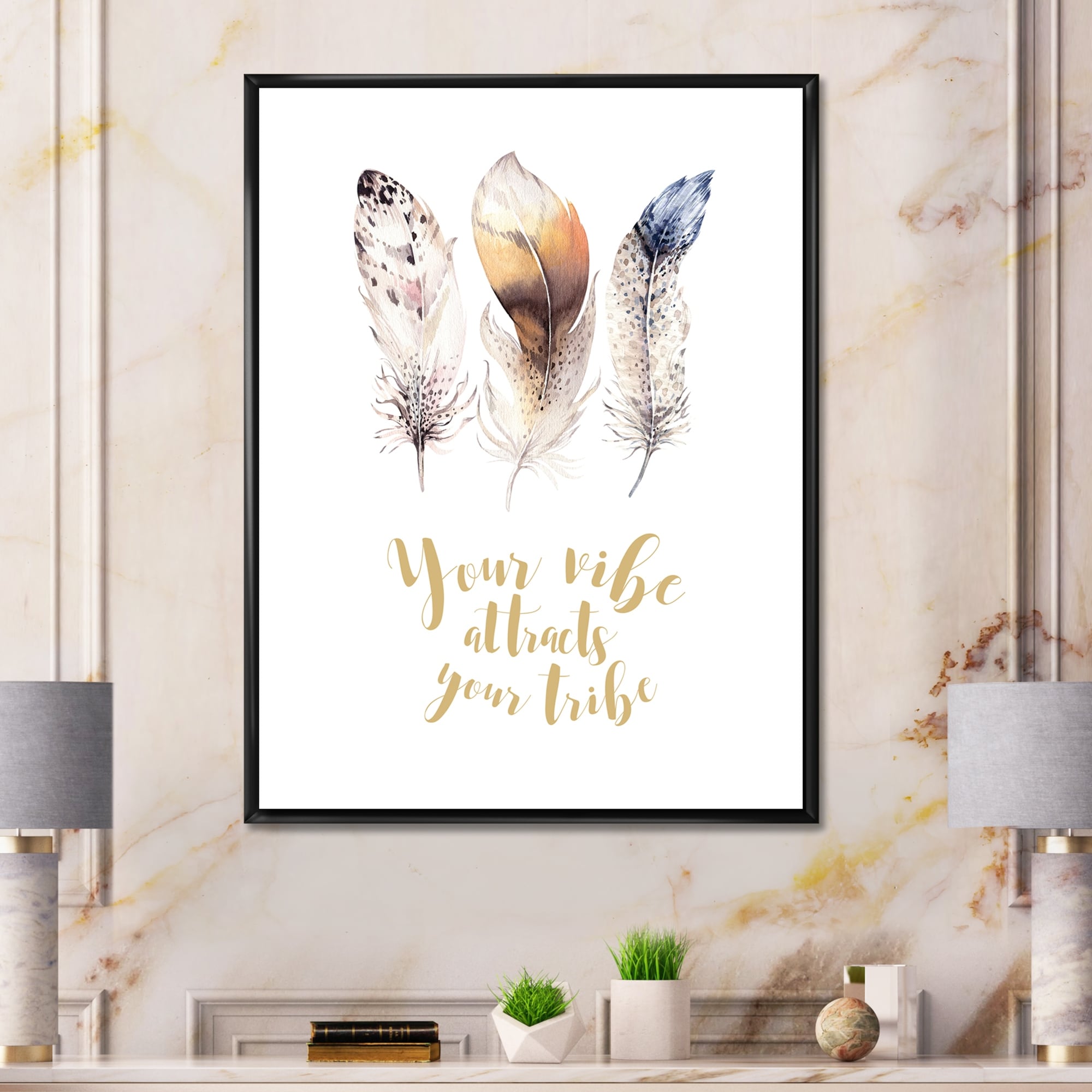 Designart "Multicolored Ethnic Feathers With Inspiring Quote" Bohemian & Eclectic Framed Canvas Wall Art Print