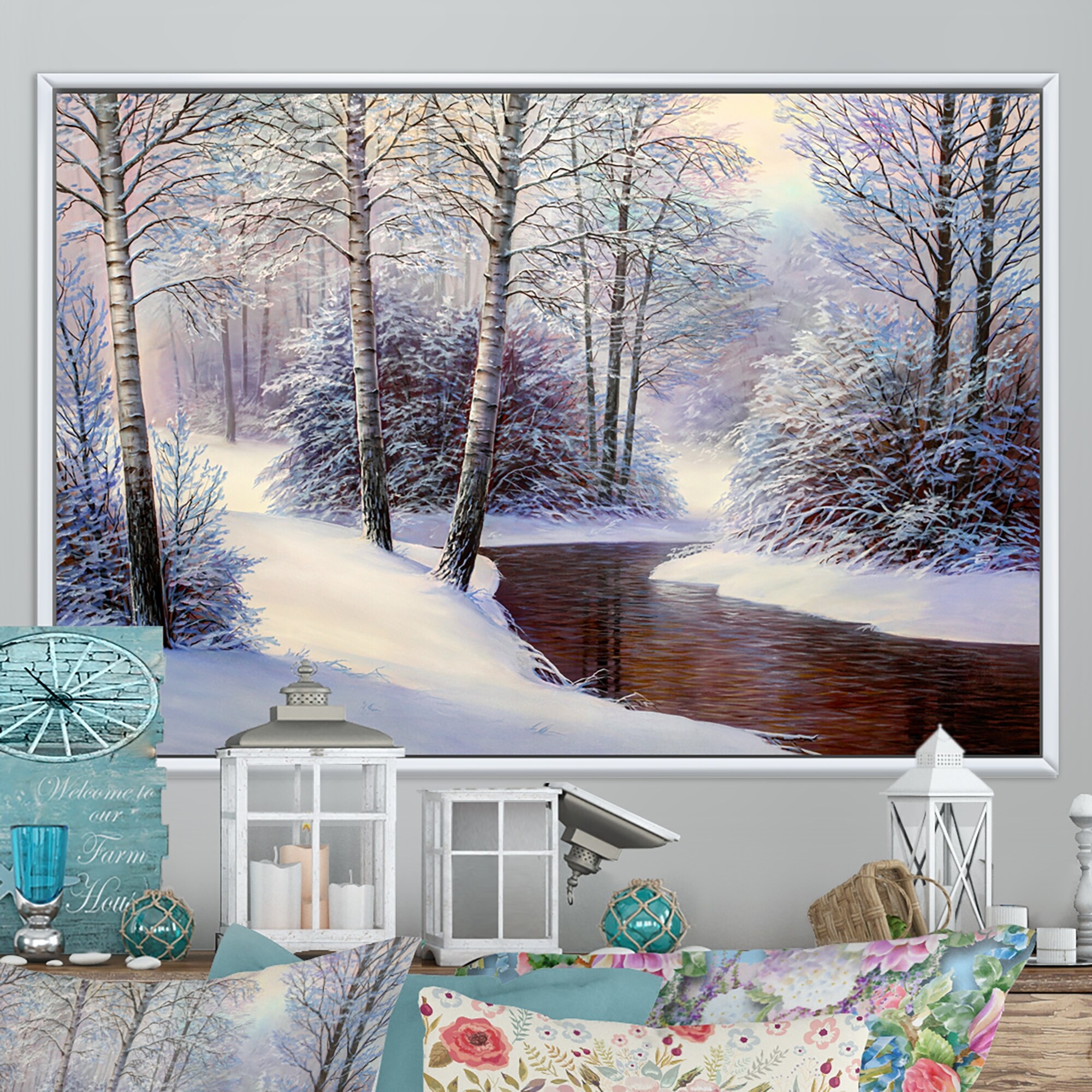 Designart "Christmas Forest With River II" Traditional Framed Christmas Canvas Wall Art