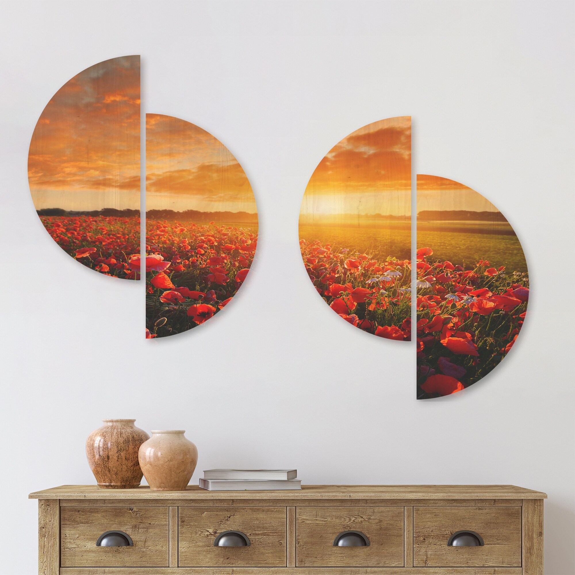 Designart 'Beautiful Poppy Field at Sunset' Abstract Wood Wall Art Set of 4 Half Circles - Multi-Color