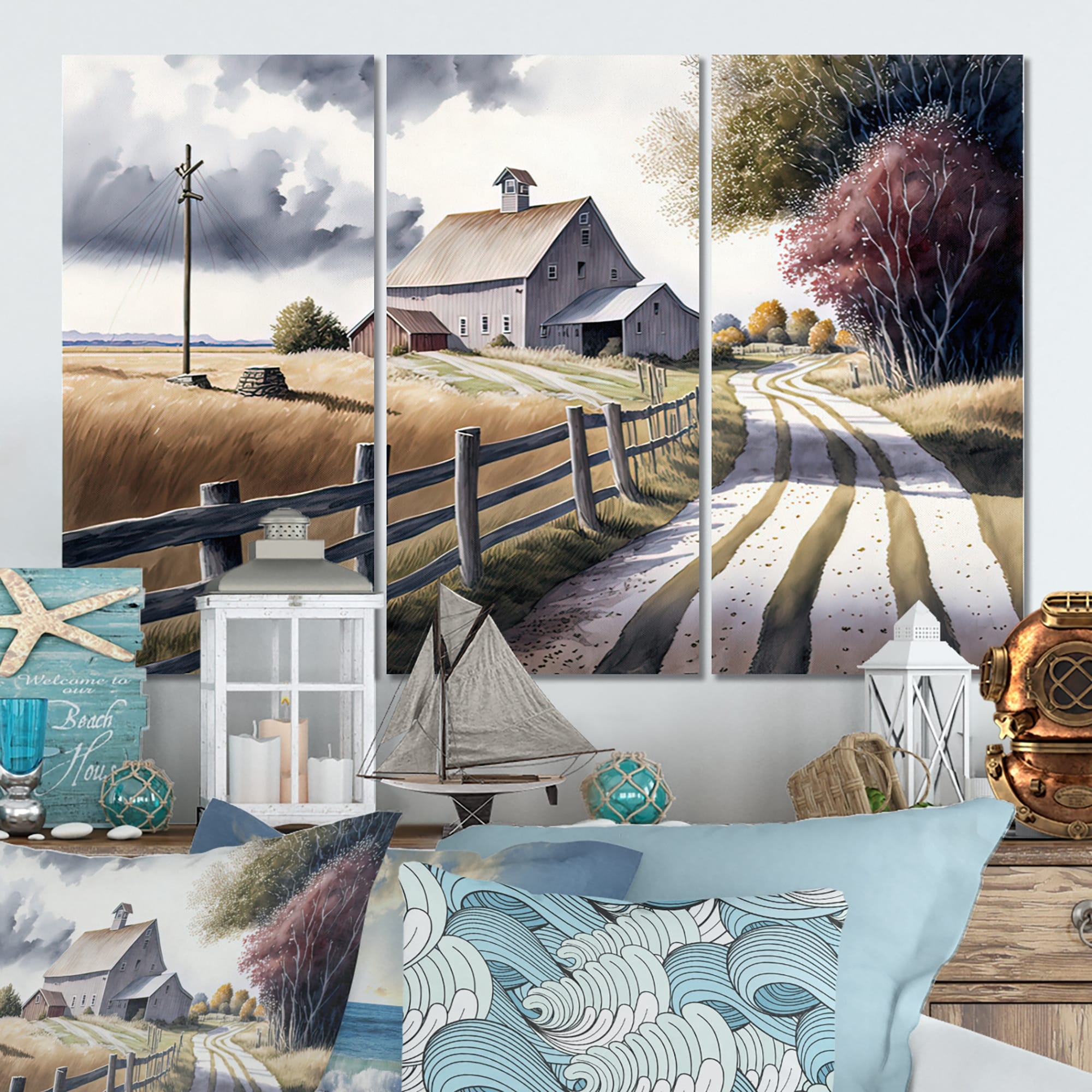 Designart "Path To the Barn V" Farmhouse / Country Canvas Wall Art - 3 Panels