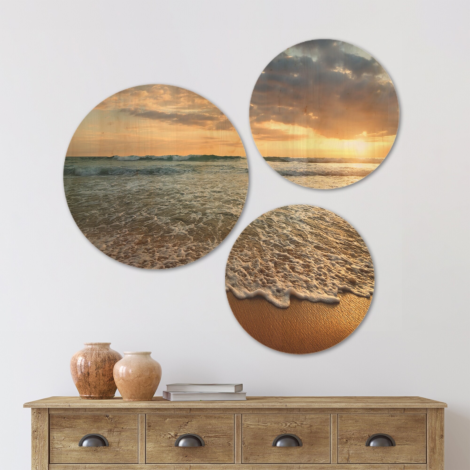 Designart 'Bright Cloudy Sunset in Calm Ocean' Seashore Wood Wall Art Set of 3 Circles