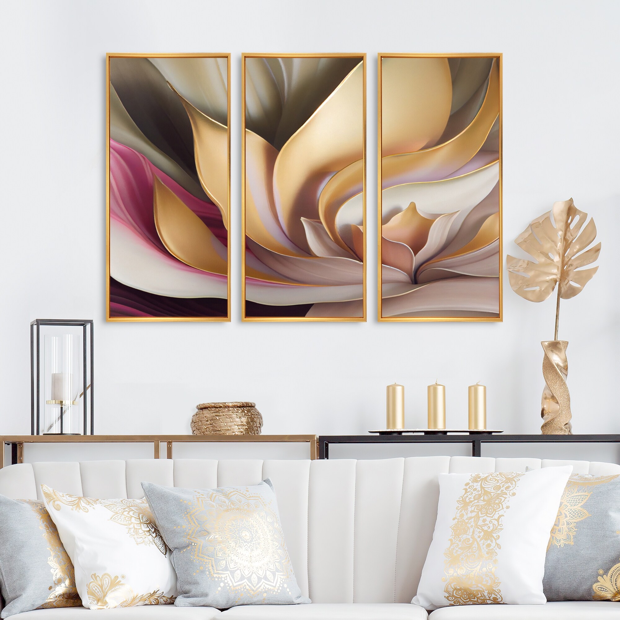 Designart "Minimal Liquid Gold And Taupe Waves V" Abstract Liquid Ink Framed Canvas Wall Art Print - 3 Panels