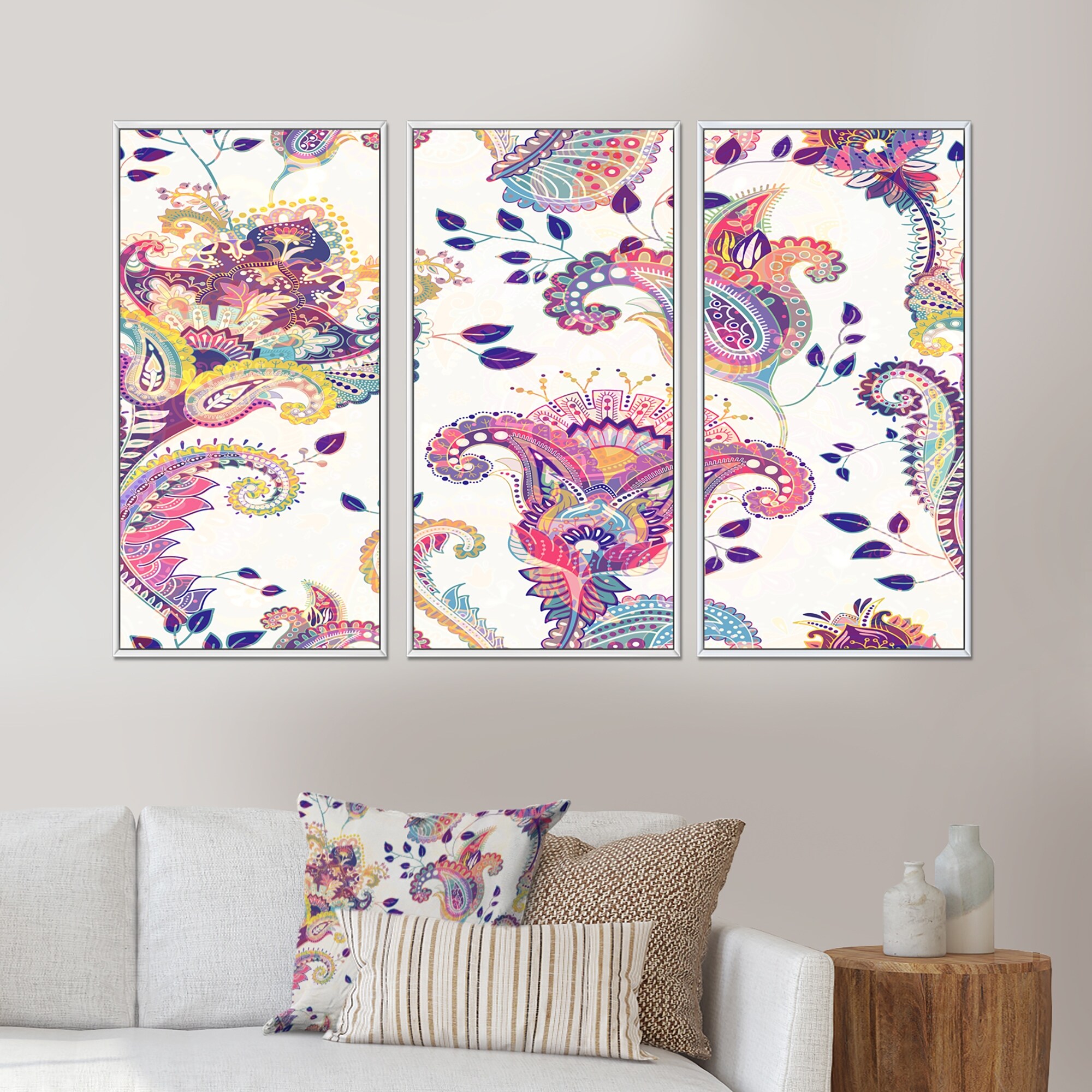 Designart "Jacobean Paisley Design" Scandinavian Framed Canvas Wall Art Set of 3 - 4 Colors of Frames