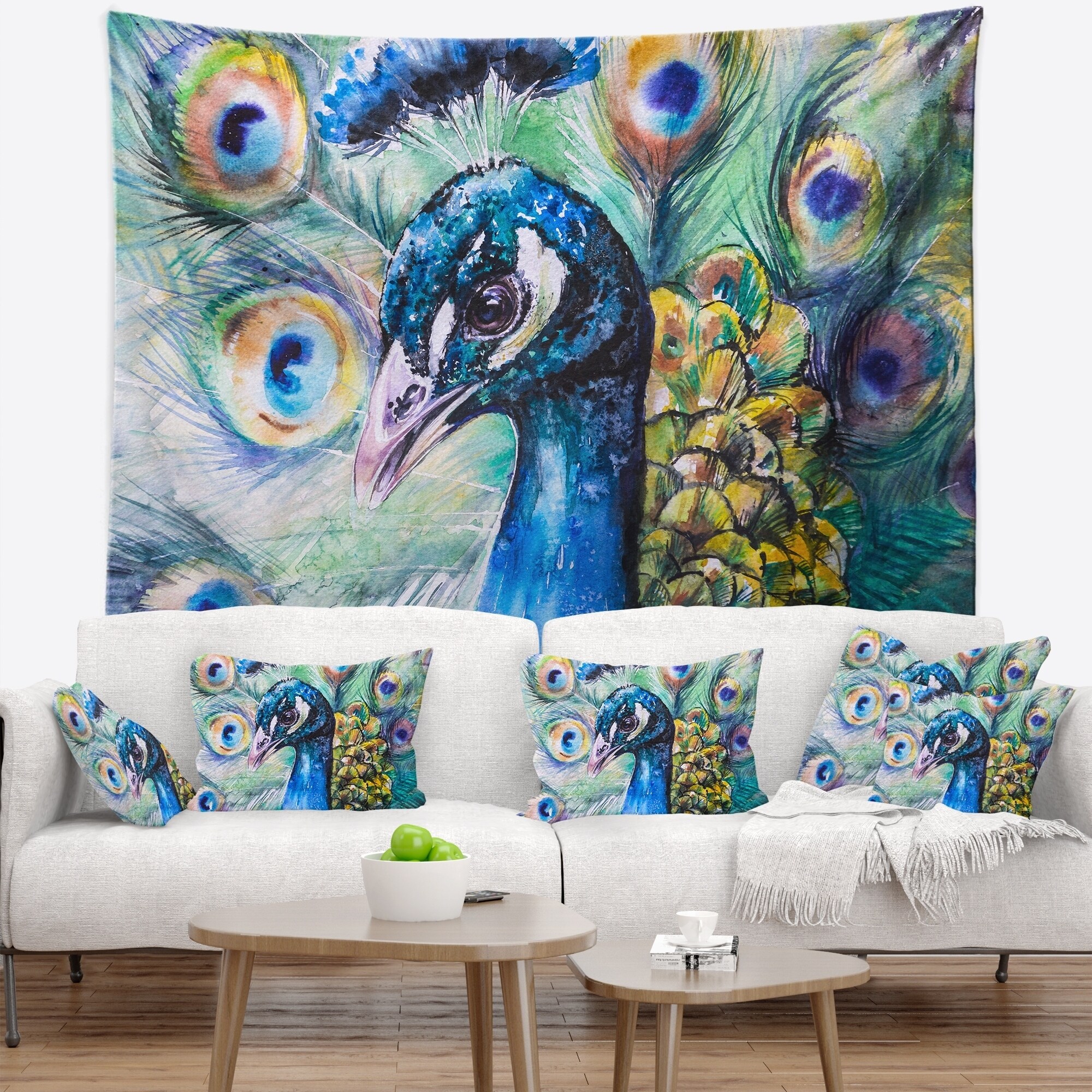Designart 'Beautiful Peacock Watercolor' Abstract Wall Tapestry