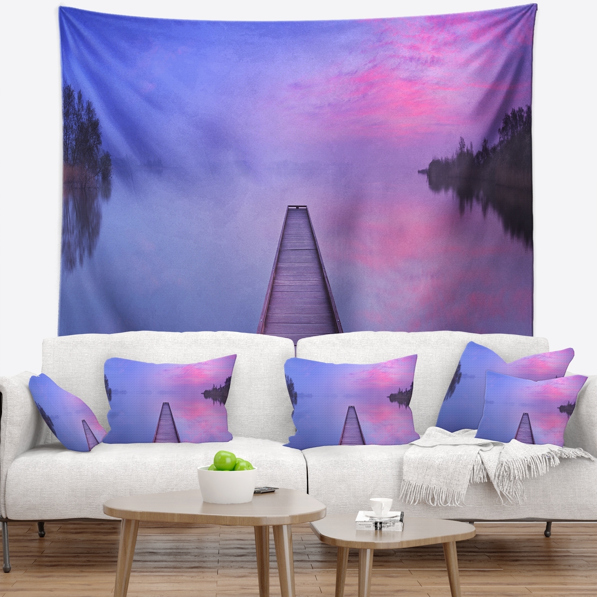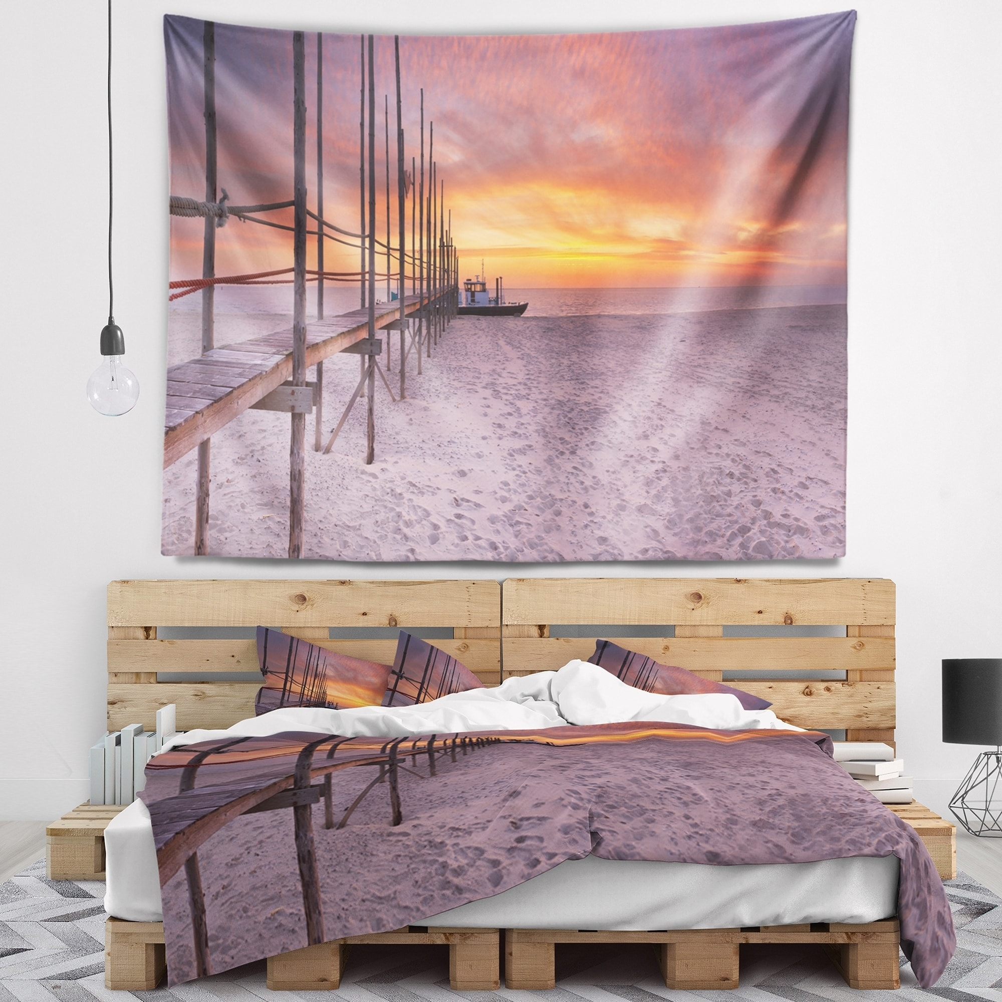 Designart 'Jetty in a Dawn Lake' Wooden Sea Bridge Wall Tapestry