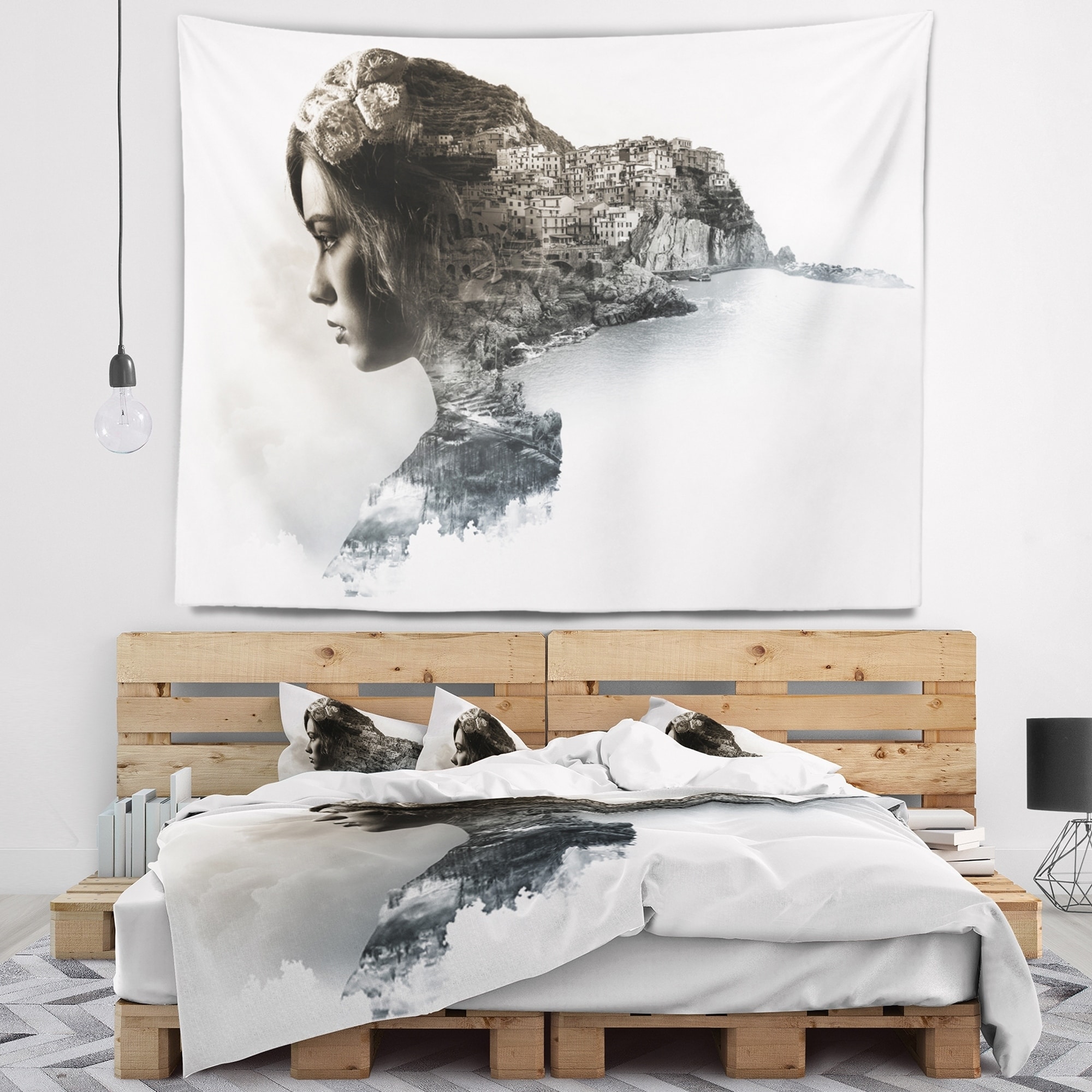 Designart 'Stylish Woman and View of Manarola' Portrait Wall Tapestry