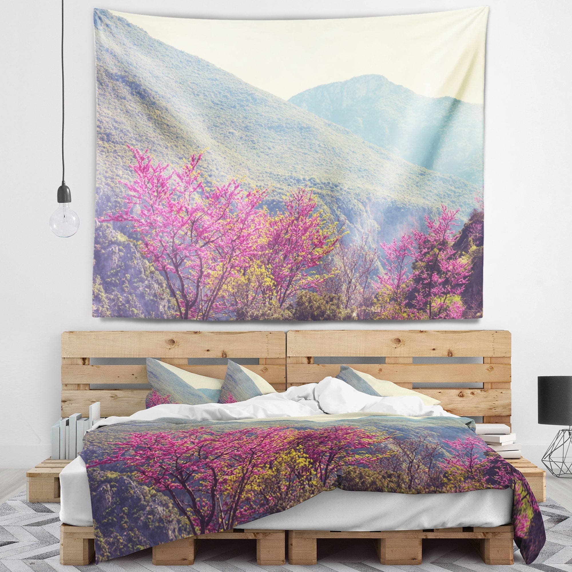 Designart 'Pink Blossoming Flowers in Mountains' Floral Wall Tapestry