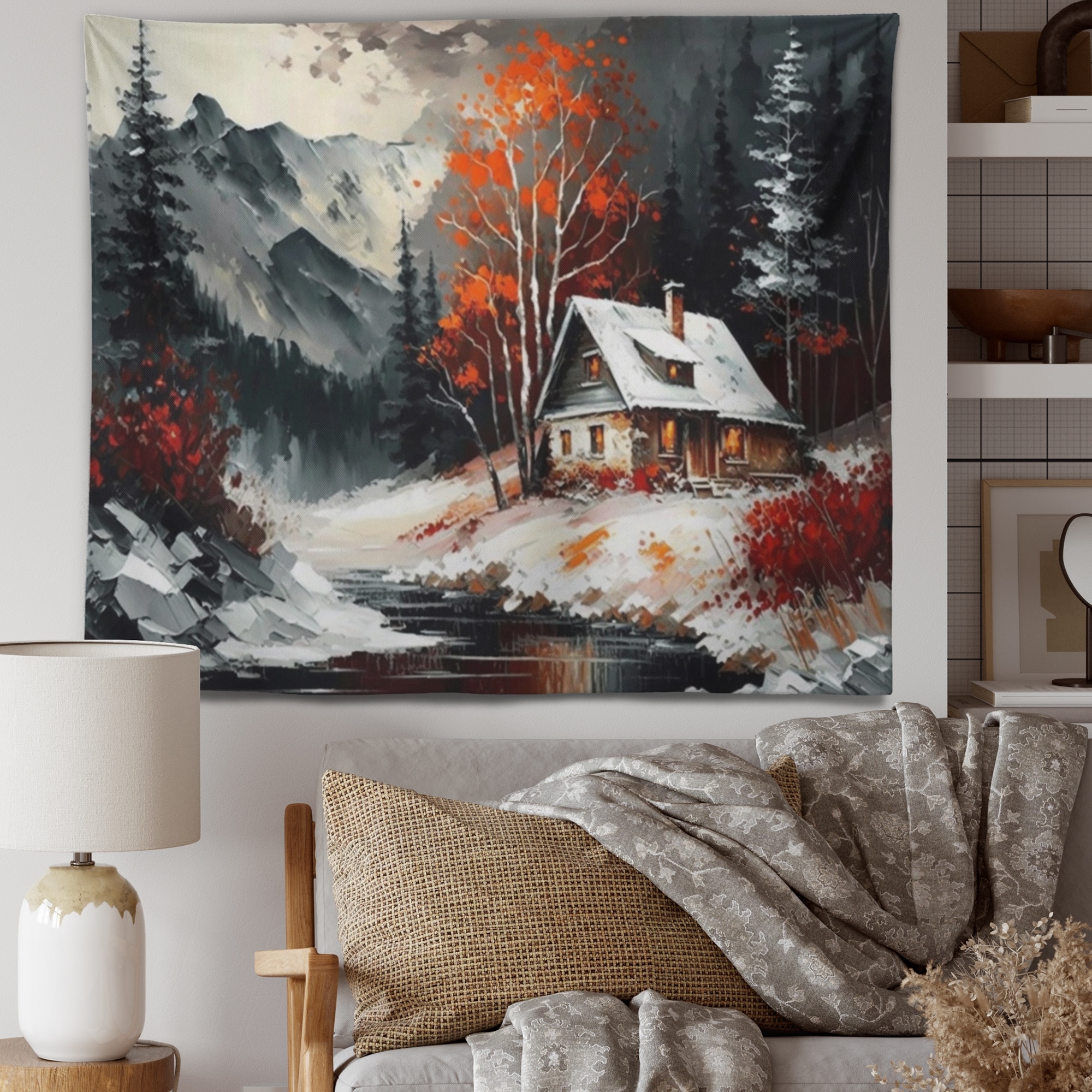 Designart 'Monochrome Orange Cottage in Winter V' Cottage Landscape Wall Tapestry