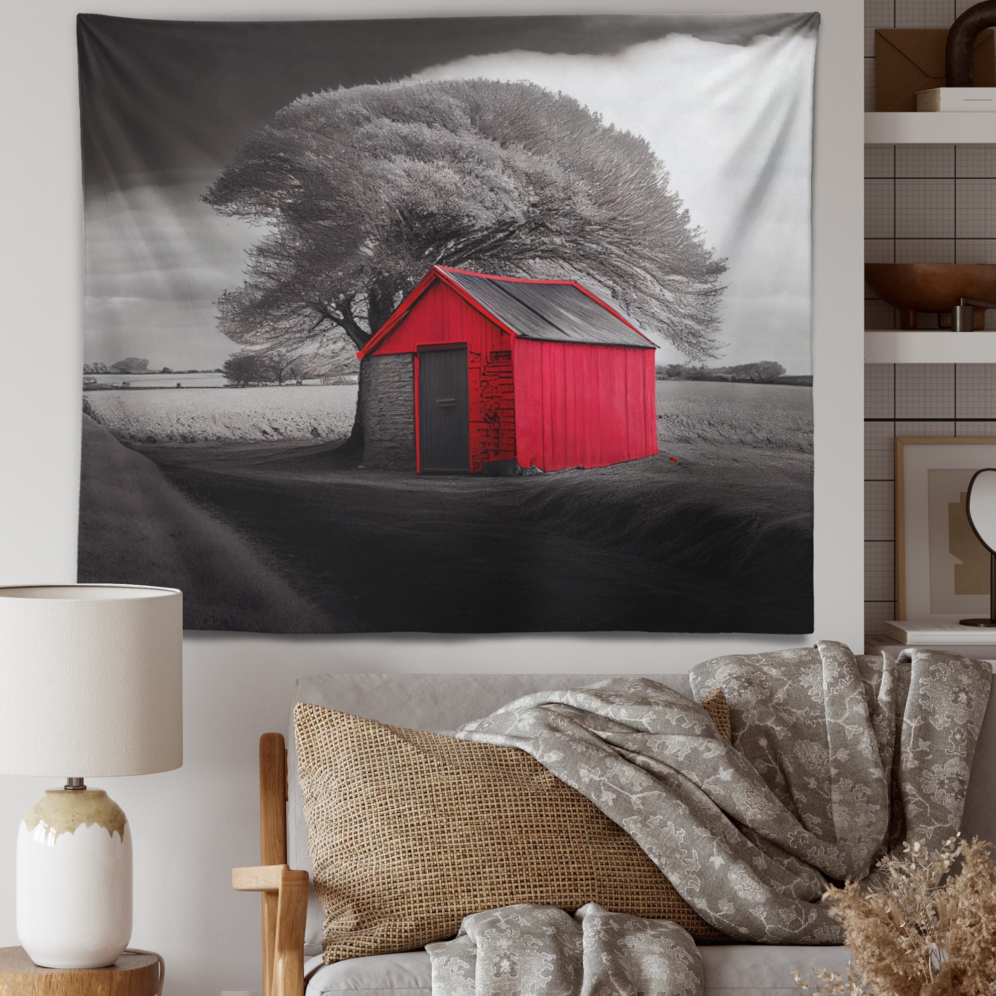 Designart 'Red Cottage in the Countryside I' Lake House Cottage Wall Tapestry