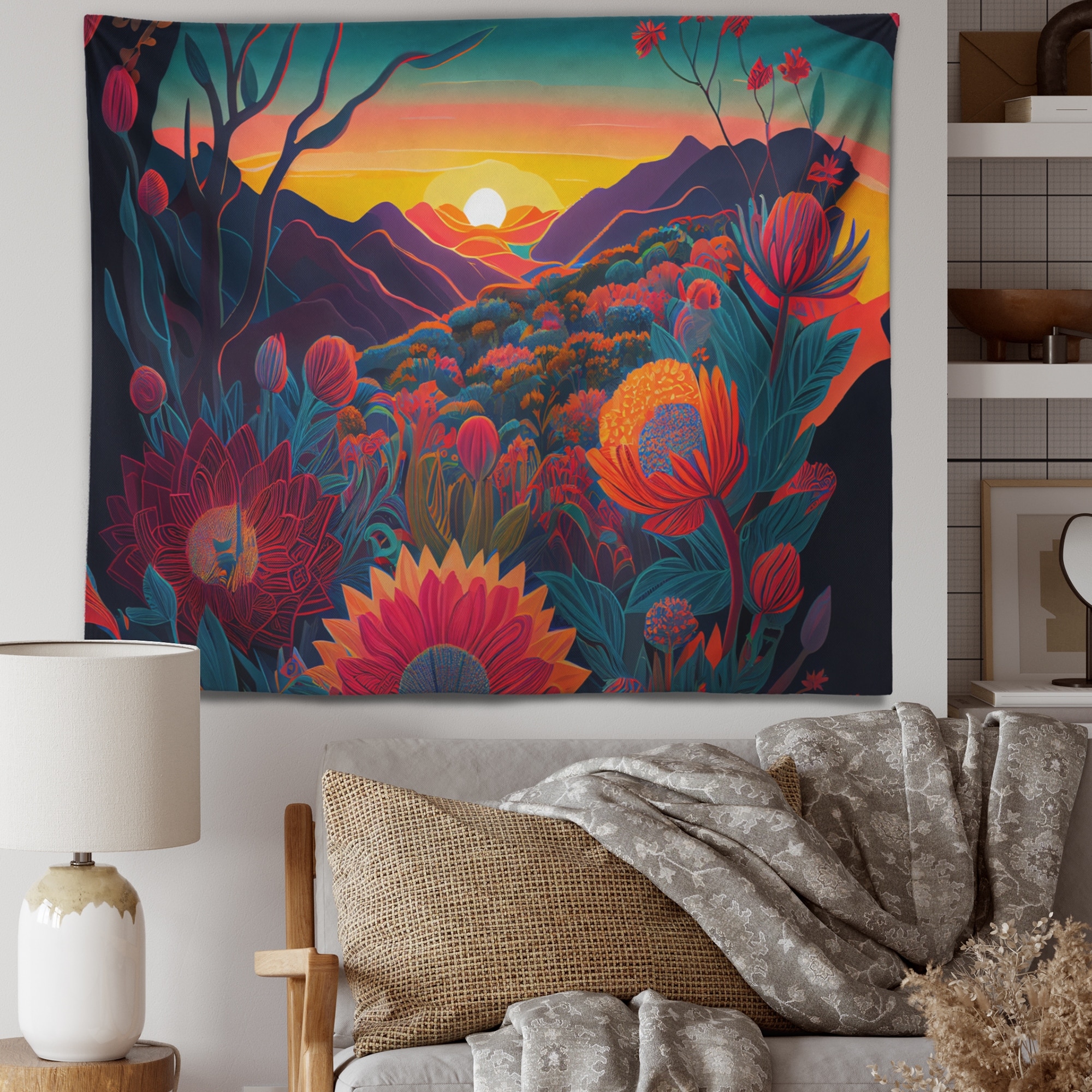 Designart 'Colorful Flowers During Golden Hour II' Landscape Mountains Wall Tapestry