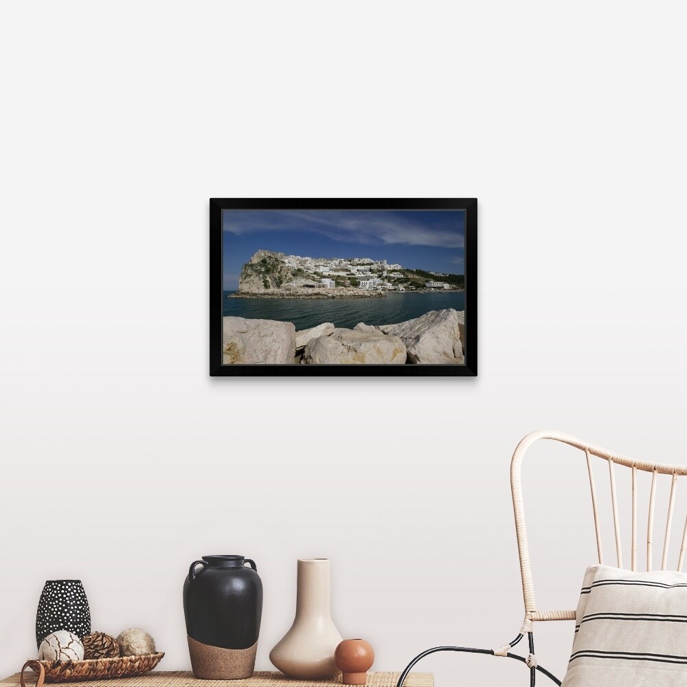 "Town on a mountain at the waterfront, Peschici, Promontorio del Gargano, Apulia, Italy" Black Framed Print