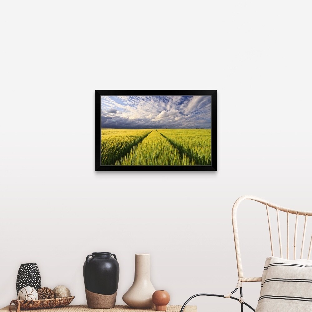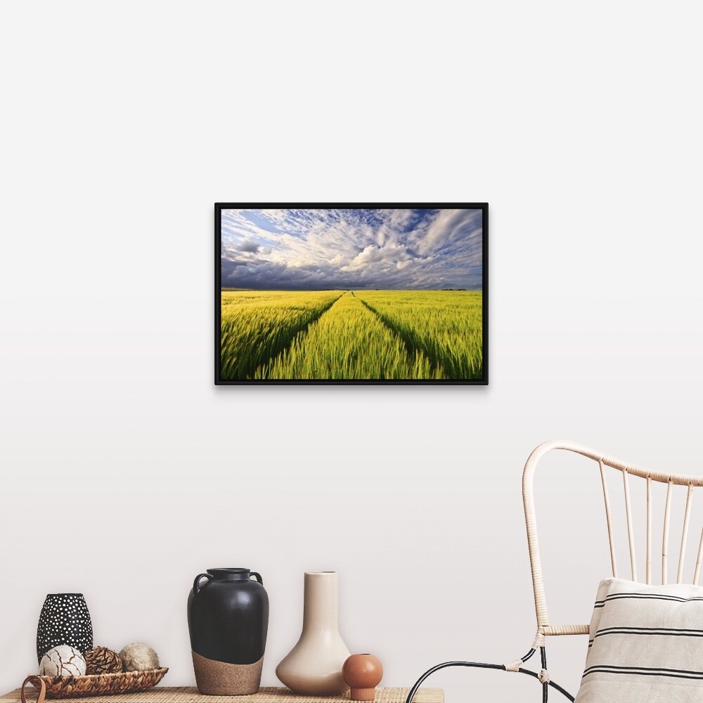 "Pathway in wheat field under dramatic sky" Black Float Frame Canvas Art