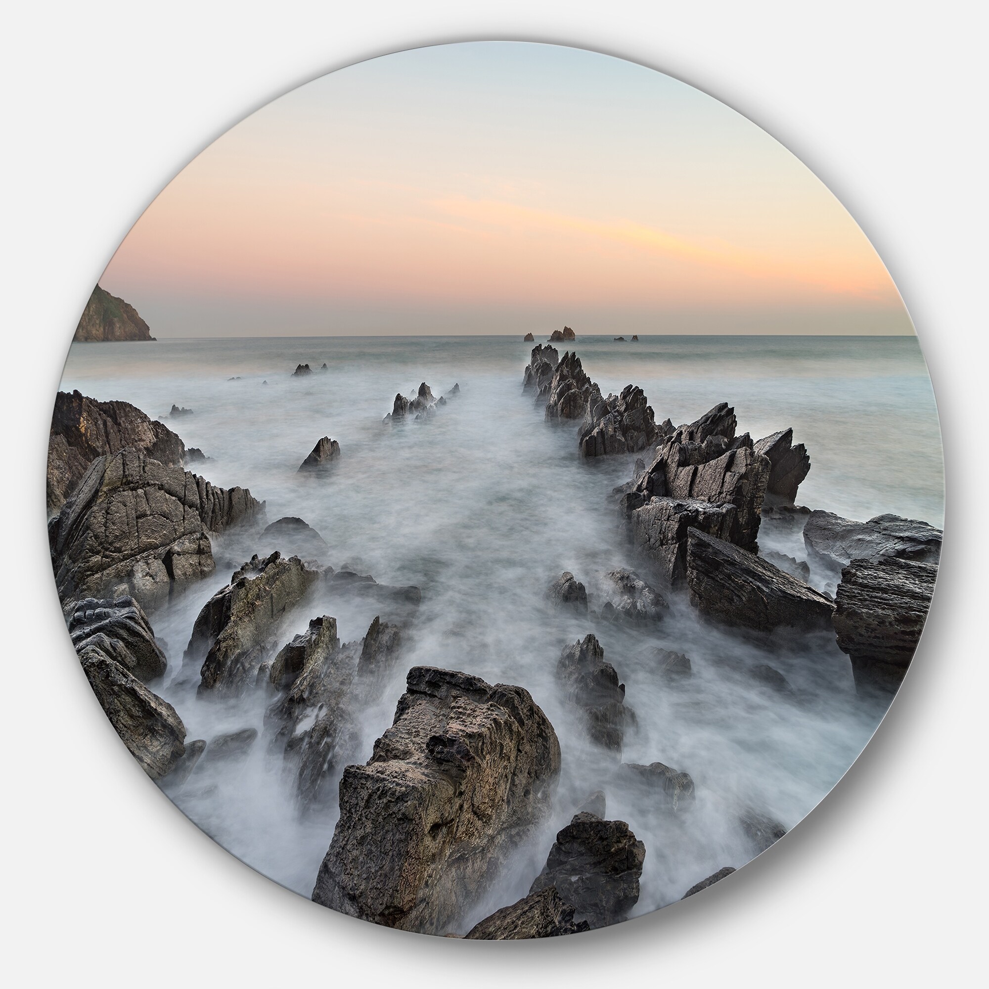 Designart 'Rocky Beach with White Waters' Modern Seashore Round Metal Wall Art