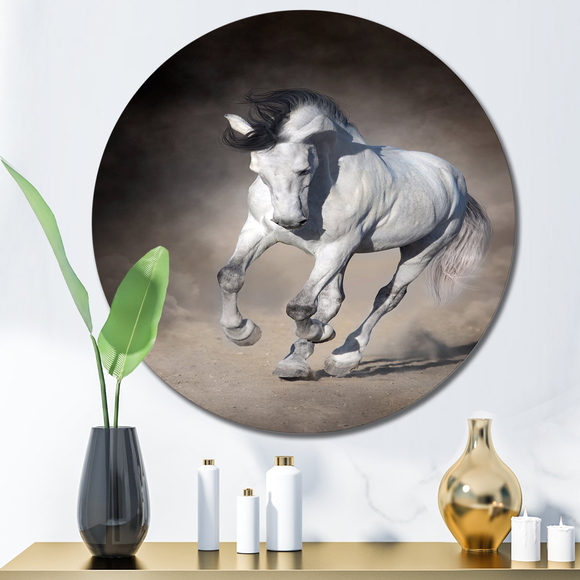 Designart 'White Horse With Long Manes Run Gallop on Desert' Traditional Metal Circle Wall Art