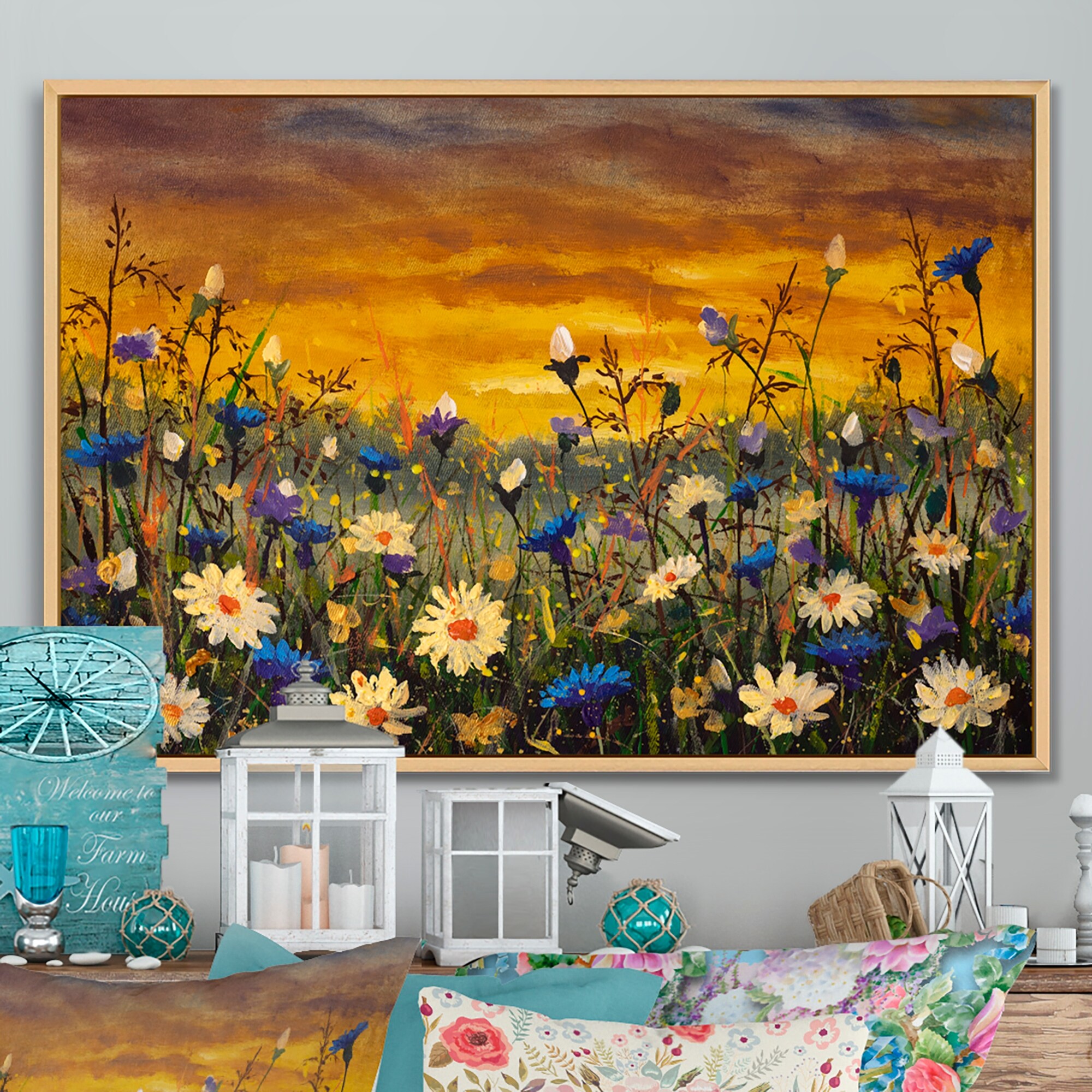 Designart "White Daisies Flowers on Sunset Painting" Traditional Framed Canvas artwork