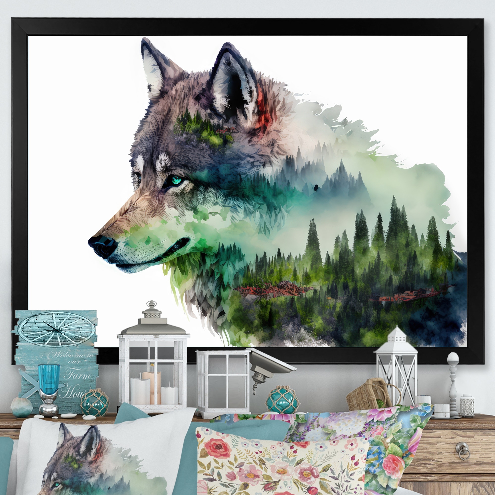 Designart "Double Exposure of a Wolf With Forest Landscape" Modern Framed Art Print