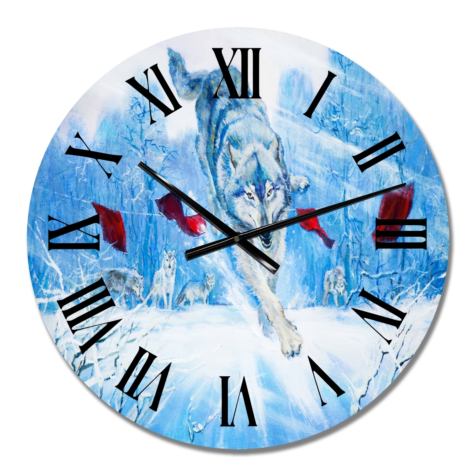 Designart 'Jumping Wolf in Blue Winter Landscape' Traditional wall clock
