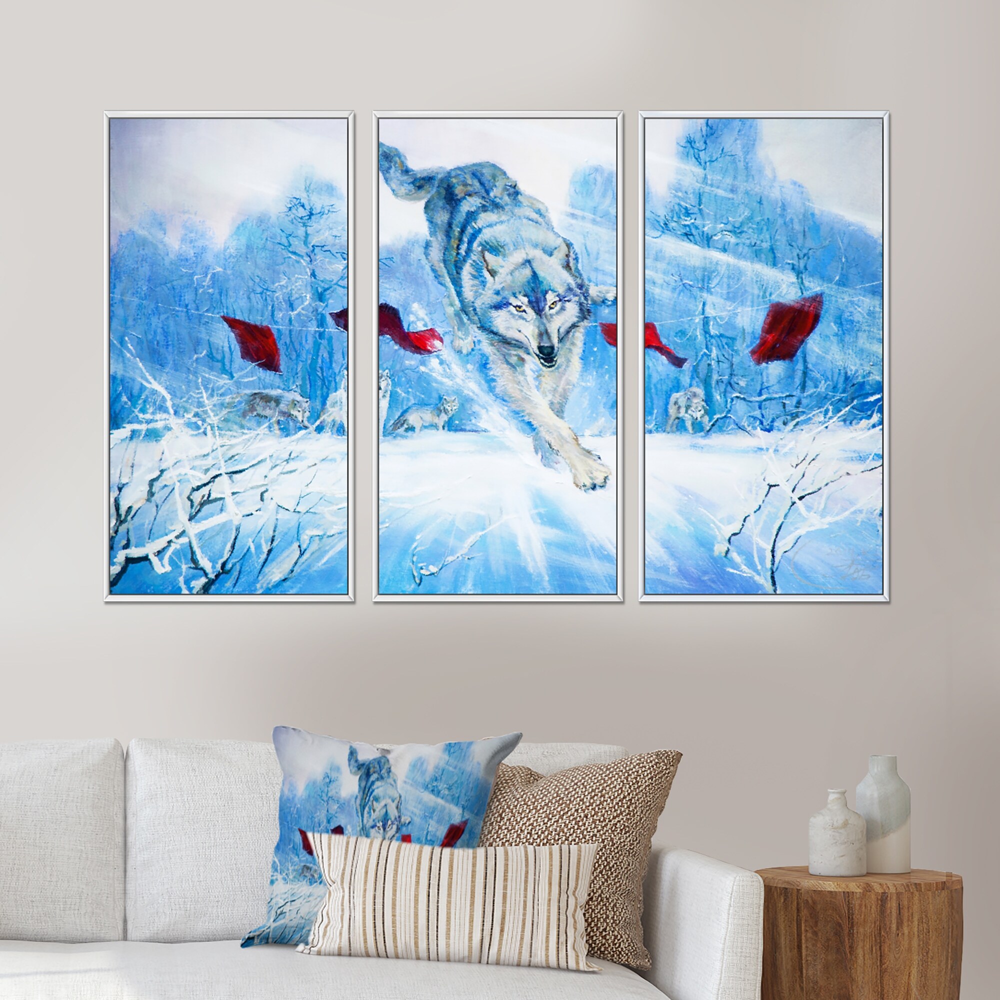 Designart "Jumping Wolf in Blue Winter Landscape" Traditional Framed Art Set of 3 - 4 Colors of Frames