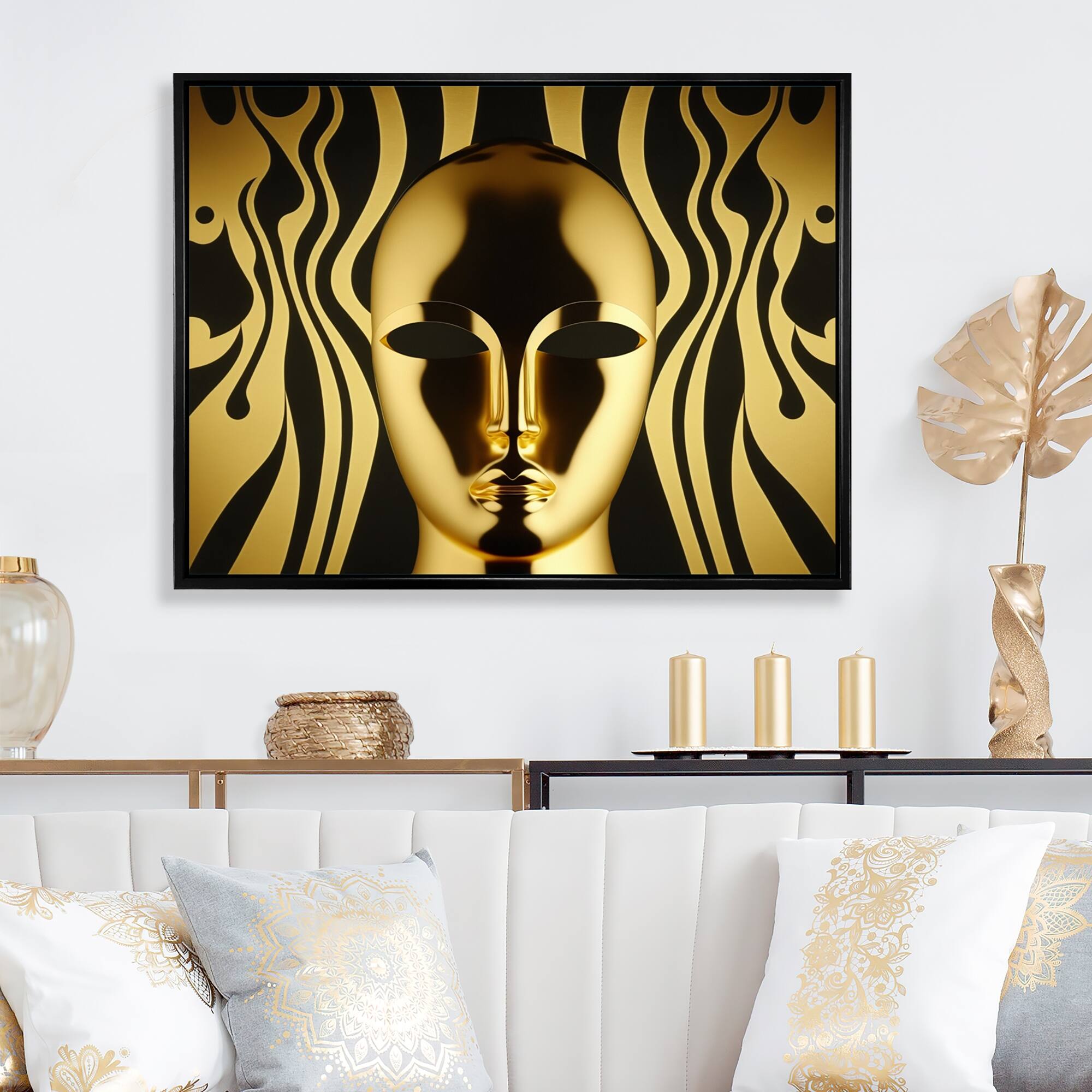 Designart "Abstract Golden Futuristic Mask" Modern Woman Framed Canvas Wall Art Print