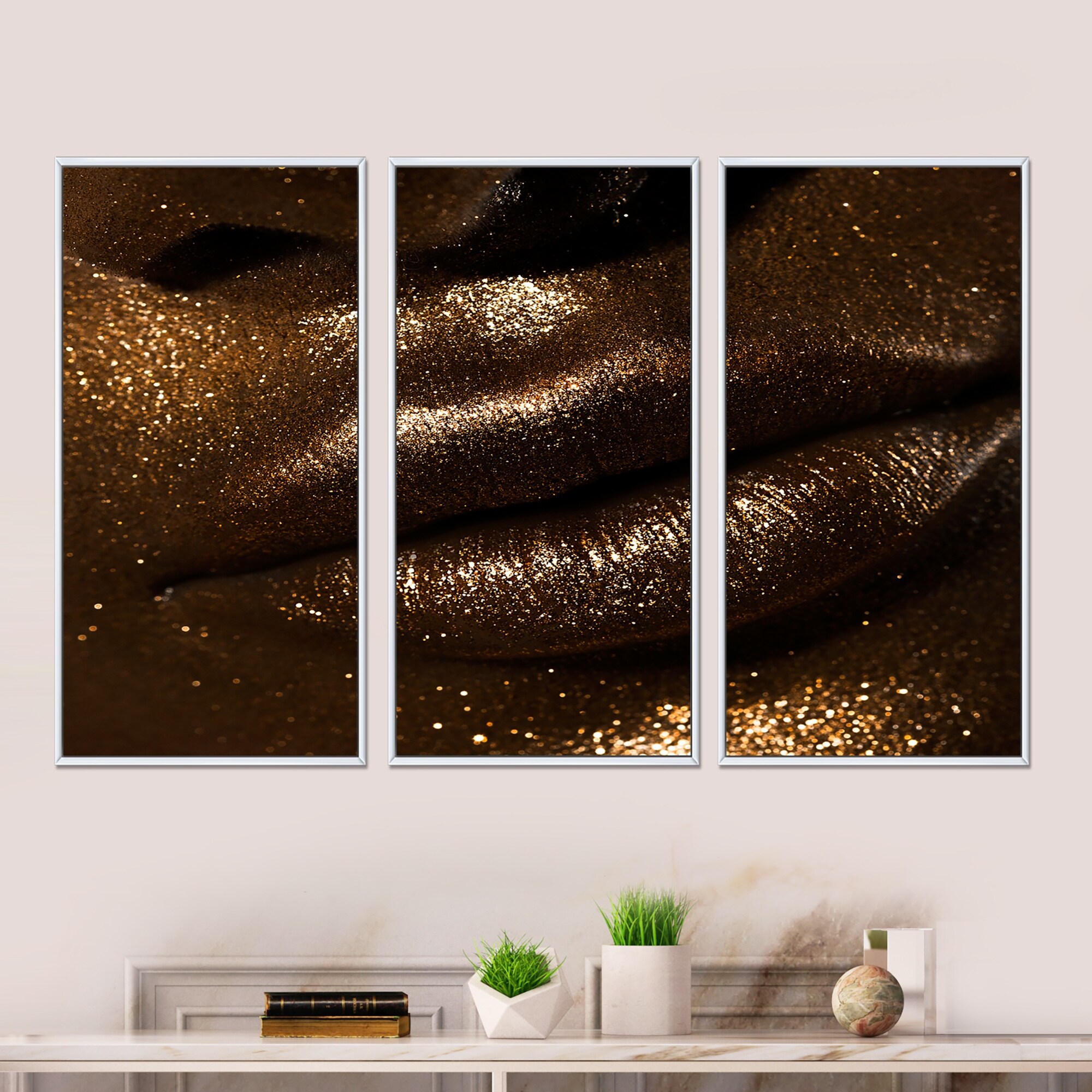 Designart "Woman Lips With Glitter and Spangle" Modern Framed Wall Art Set of 3 - 4 Colors of Frames