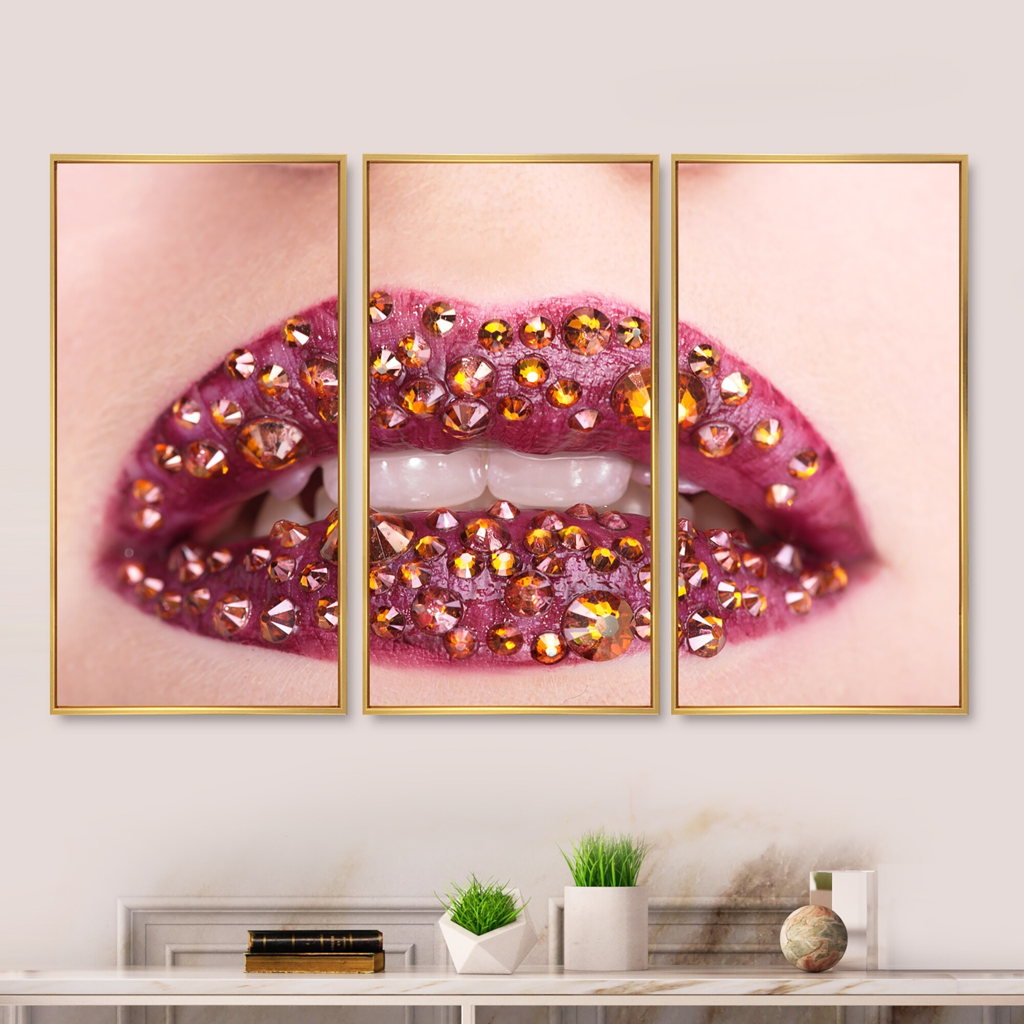 Designart "Close-Up Of Woman Lips With Sequins" Modern Framed Canvas Wall Art Print Set of 3 - 4 Colors of Frames