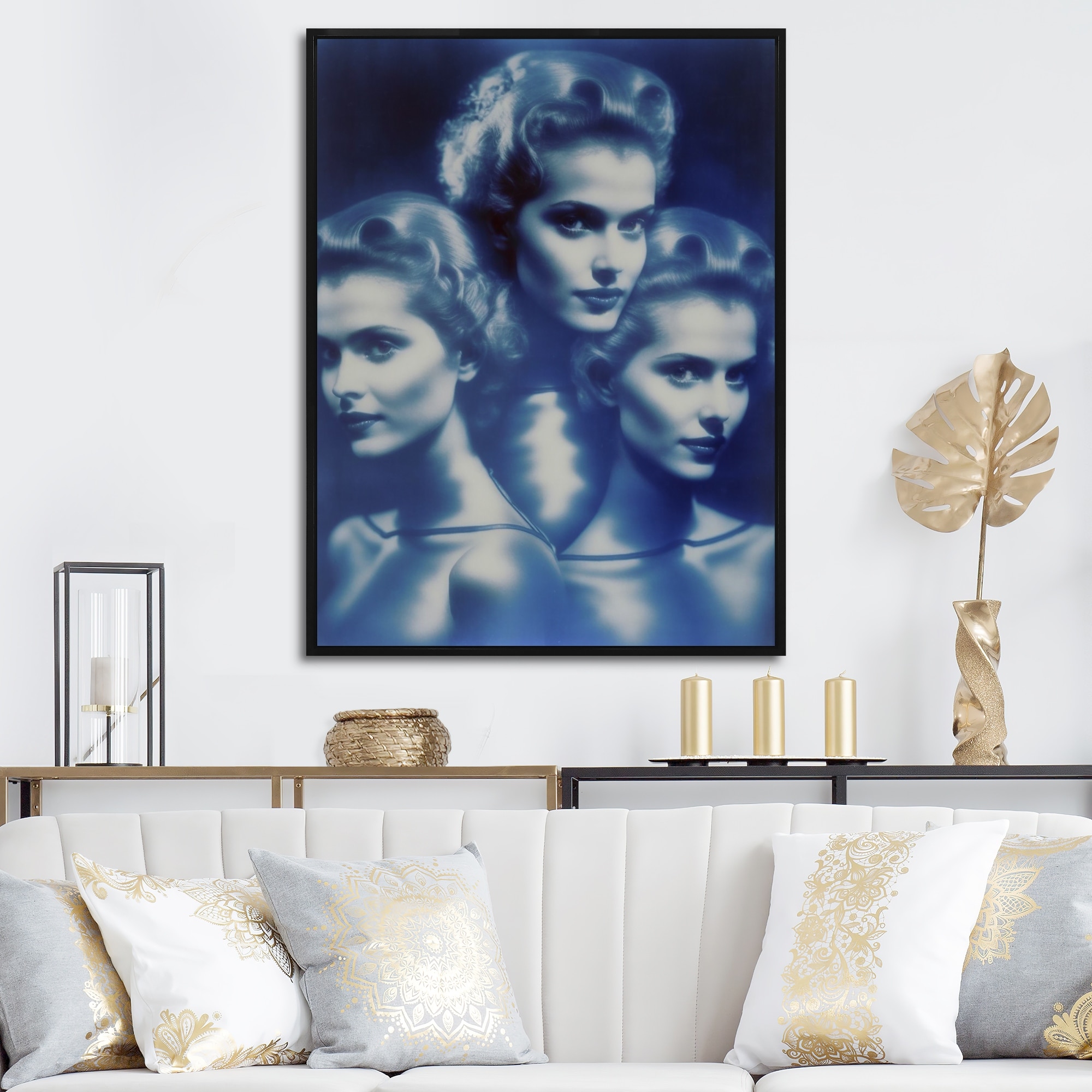 Designart "Models Double Exposure in Vintage Blue I" Fashion Woman Framed Wall Art Living Room