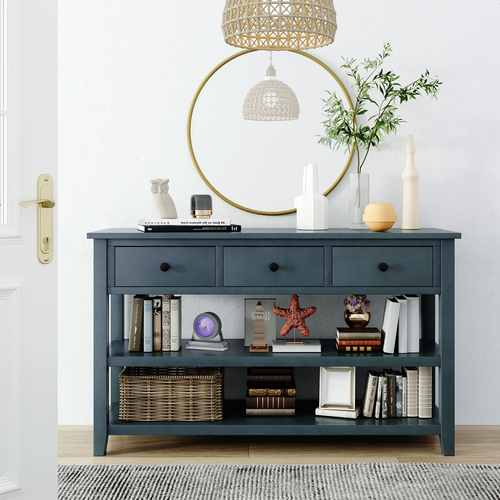 48'' Solid Pine Wood Console Table with 3 Storage Drawers and 2 Open Storage Shelves