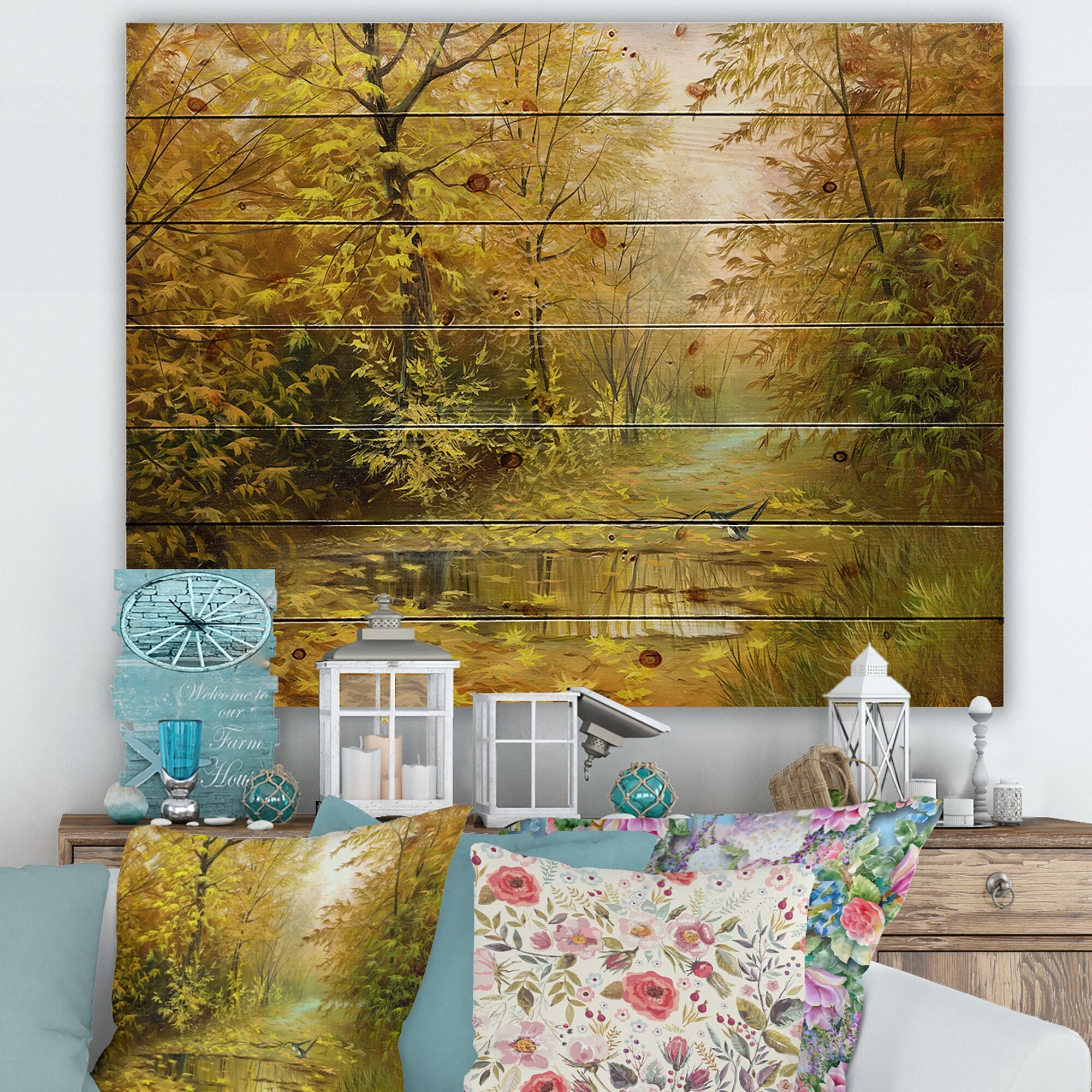Designart 'Road In Yellow Woodlands' Country Print on Natural Pine Wood