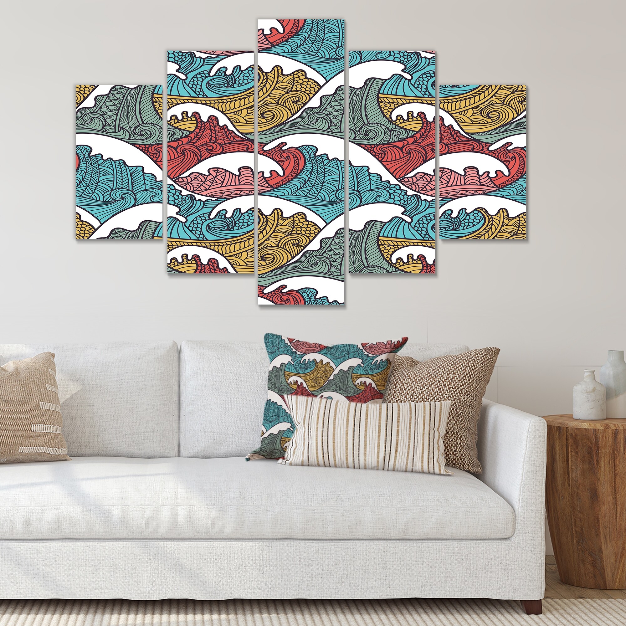 Designart "Red Blue And Grey Japanese Waves" Nautical & Coastal Canvas Wall Art Print - 60x32 - 5 Panels
