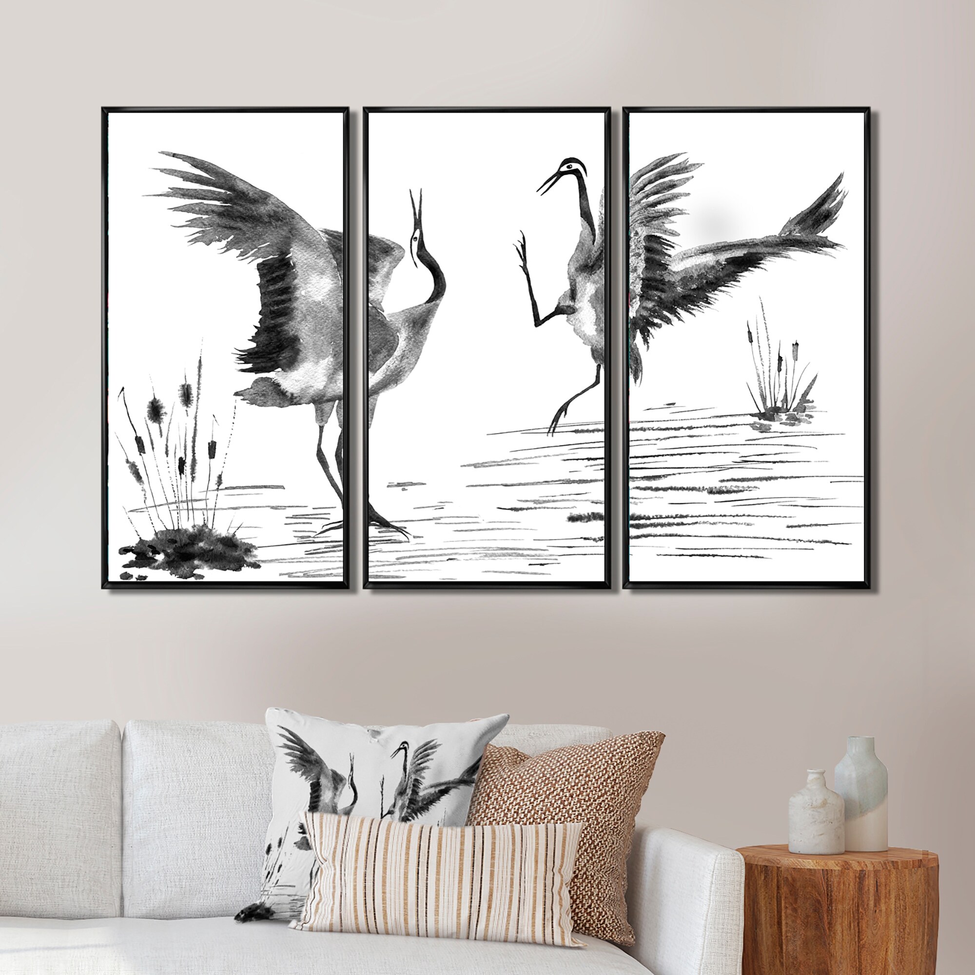 Designart "Two Enamored Japanese Cranes Birds" Traditional Framed Wall Art Set of 3 - 4 Colors of Frames