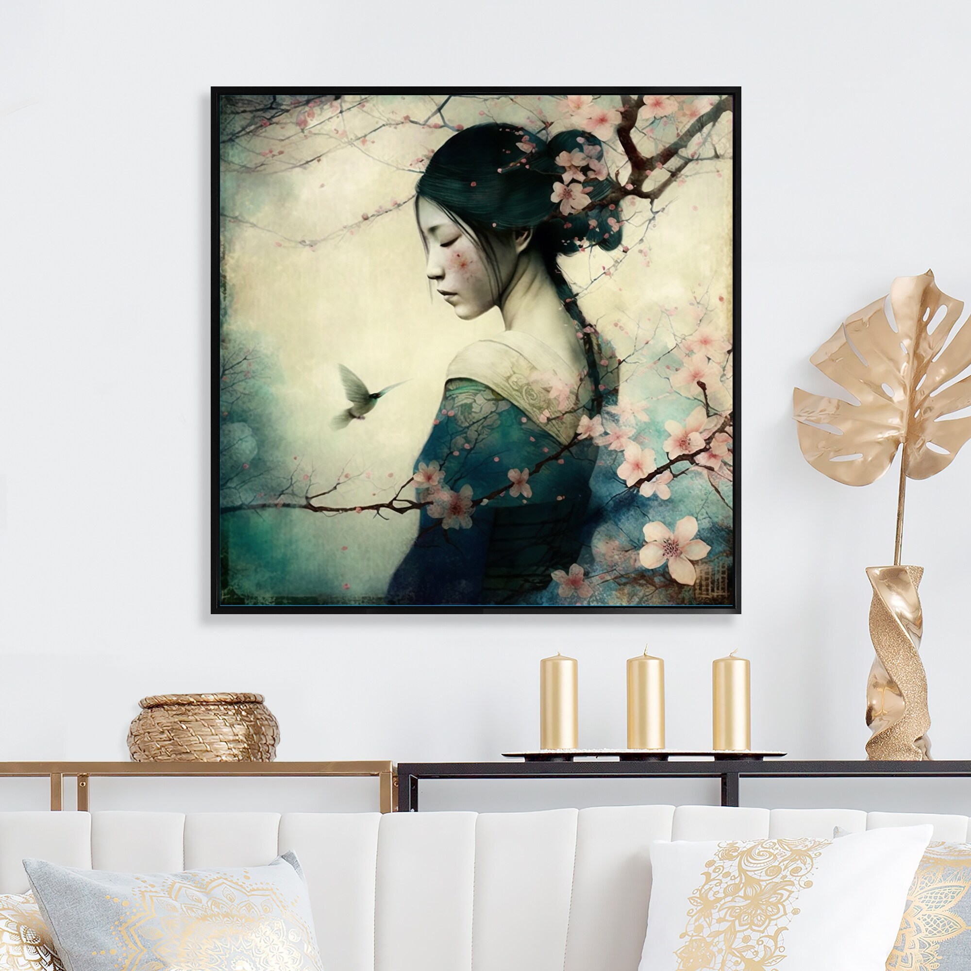 Designart "Vintage Japanese Woman With Cherry Blossoms" Asian Woman Framed Canvas Wall Art Print