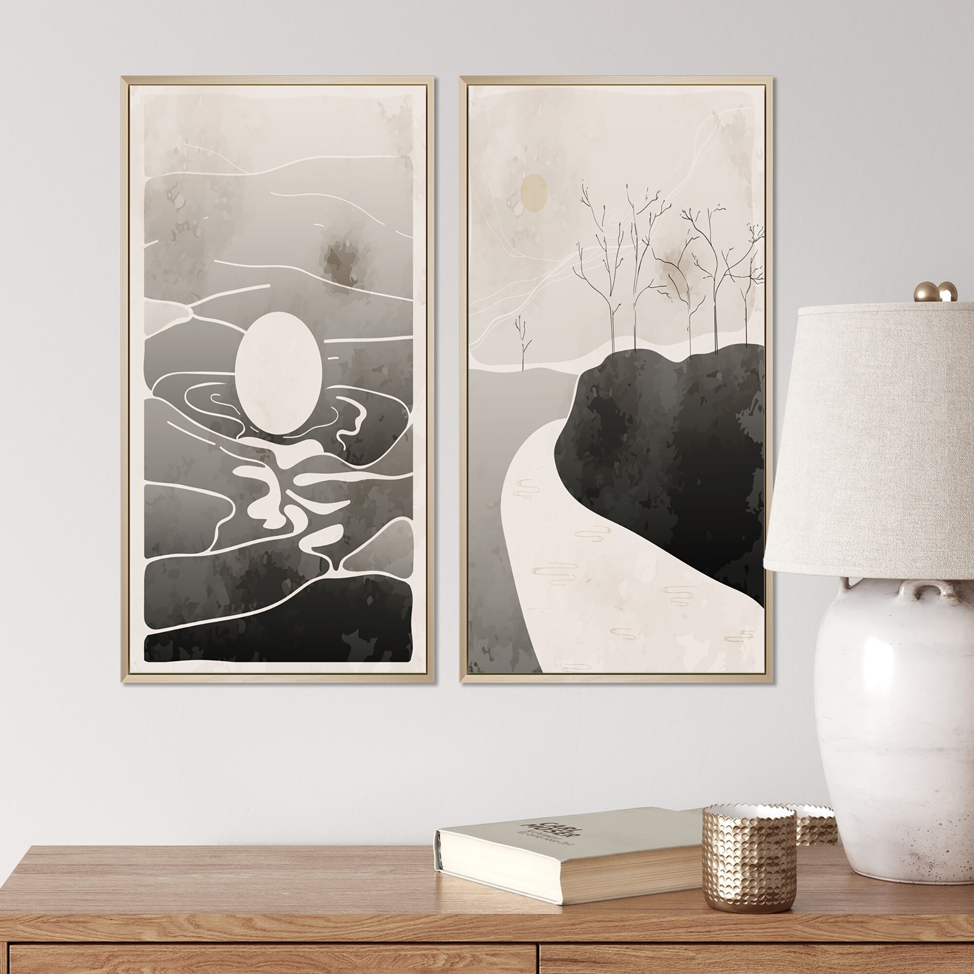 Designart "Monochrome Japanese Vintage Landscape I" Landscapes Framed Art Set of 2 Pieces