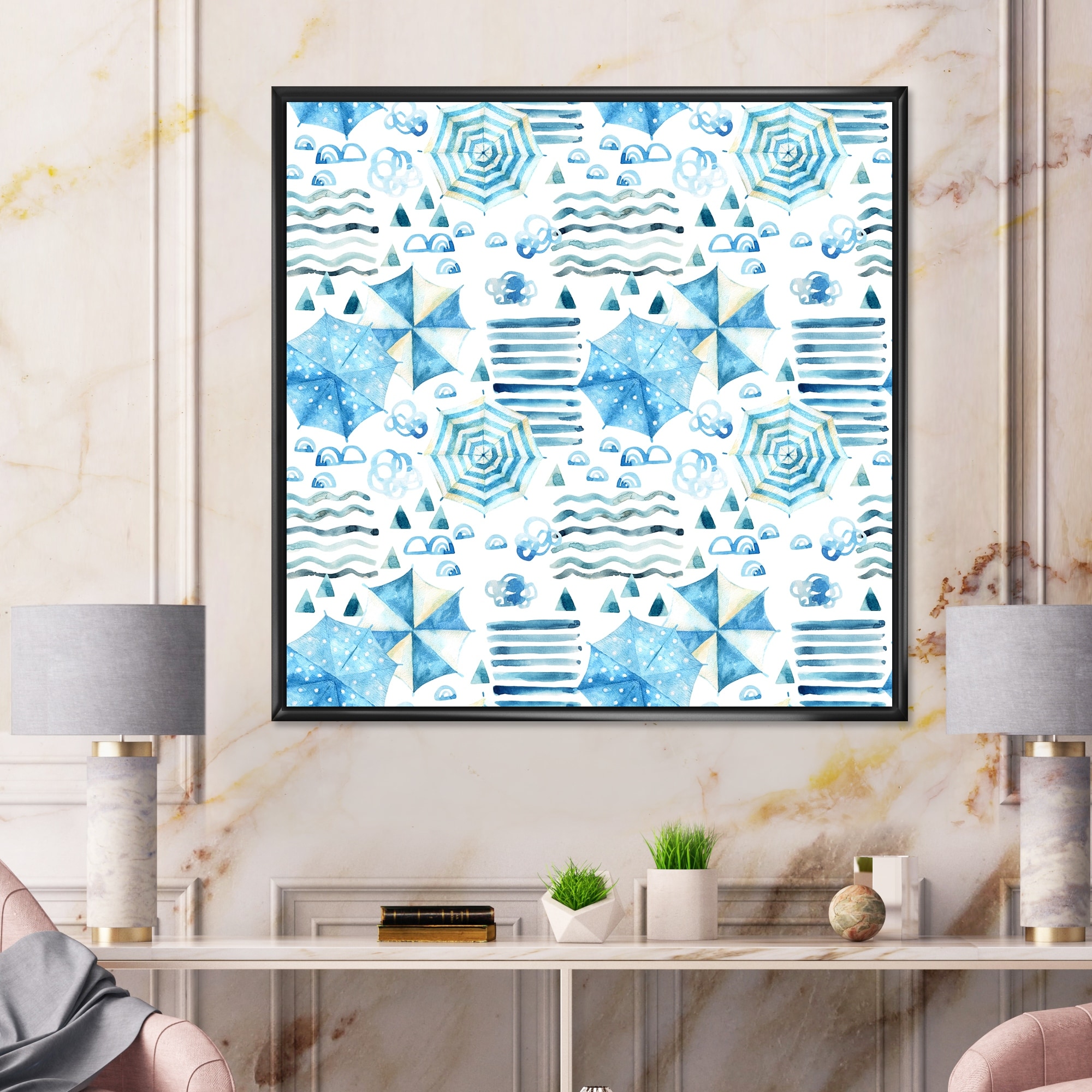 Designart "Vacation Sun With Water Waves Sun And Umbrella I" Patterned Framed Art Print