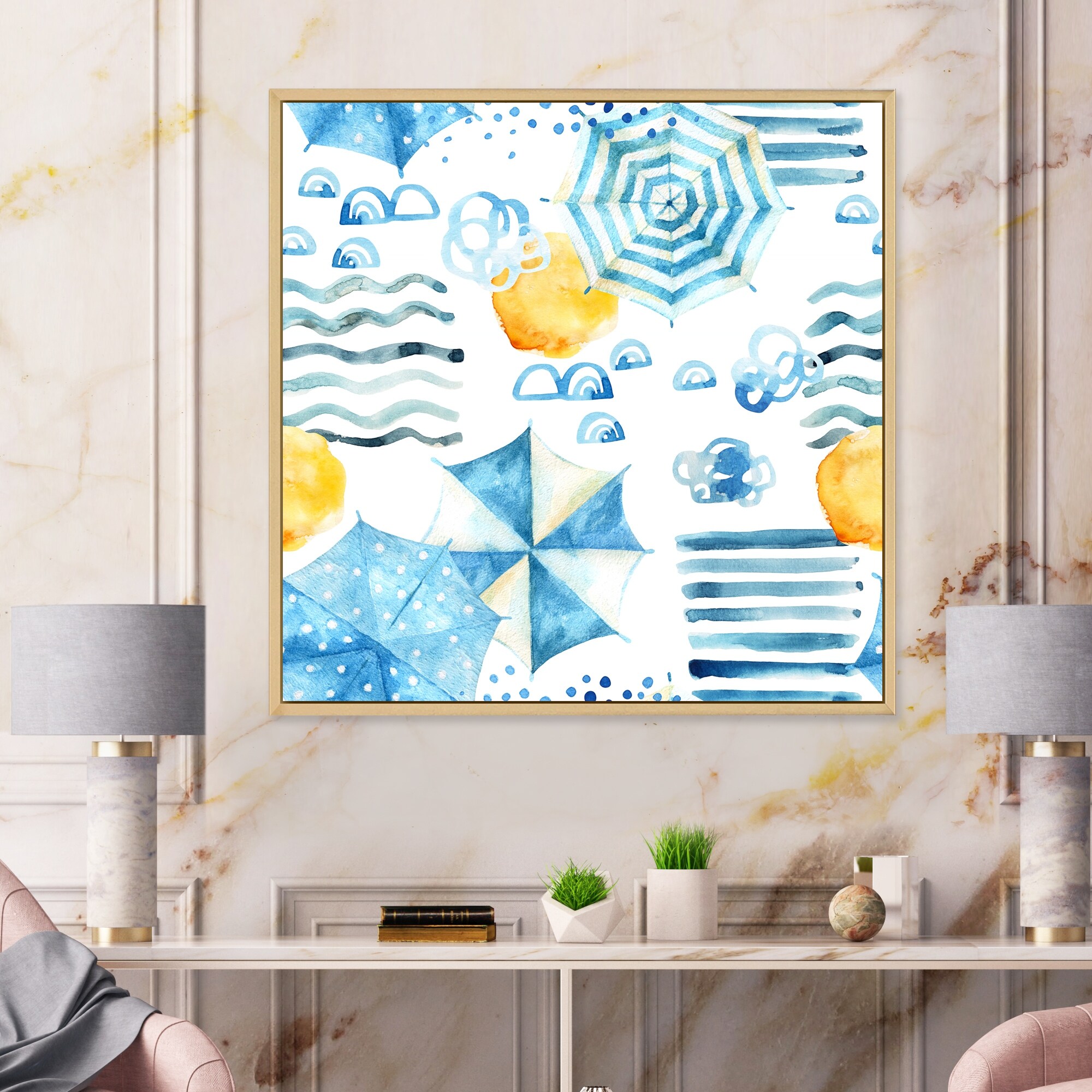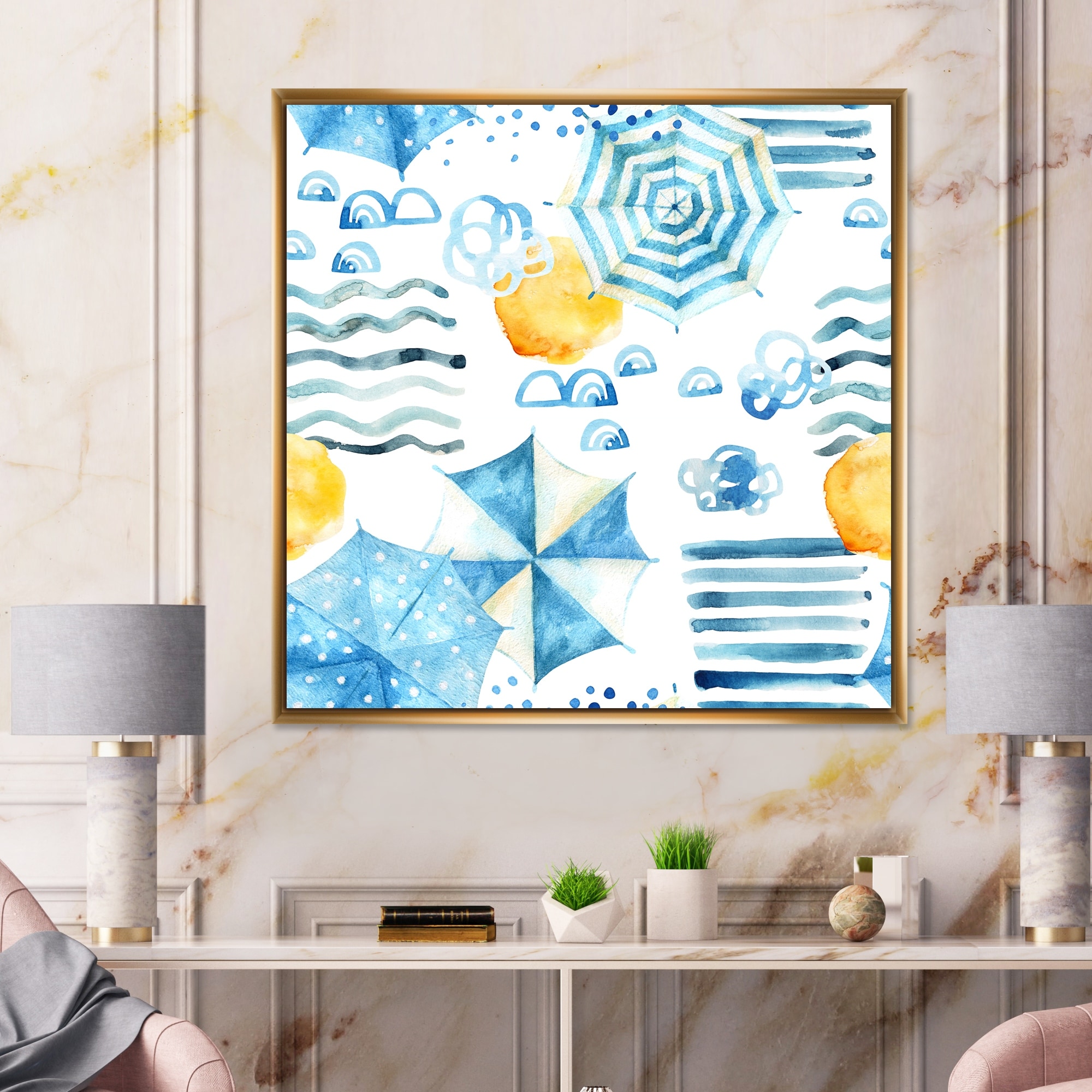 Designart "Vacation Sun With Water Waves Sun And Umbrella III" Patterned Framed Canvas Wall Art Print
