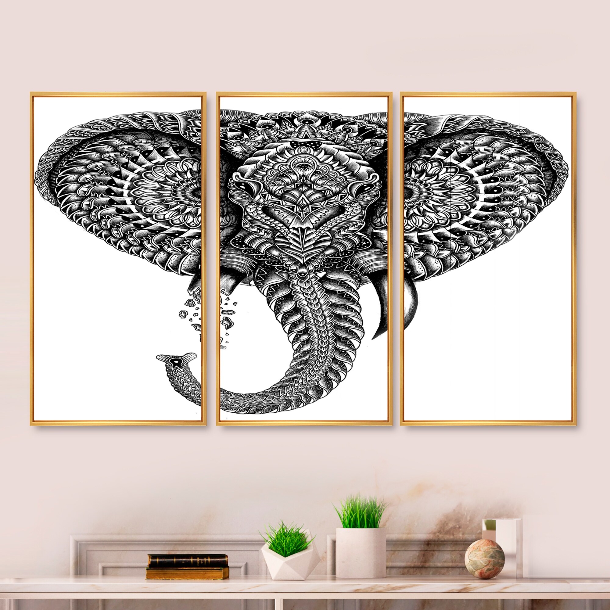 Designart "Handdrawn Elephant" Farmhouse Framed Canvas Wall Art Print Set of 3 - 4 Colors of Frames