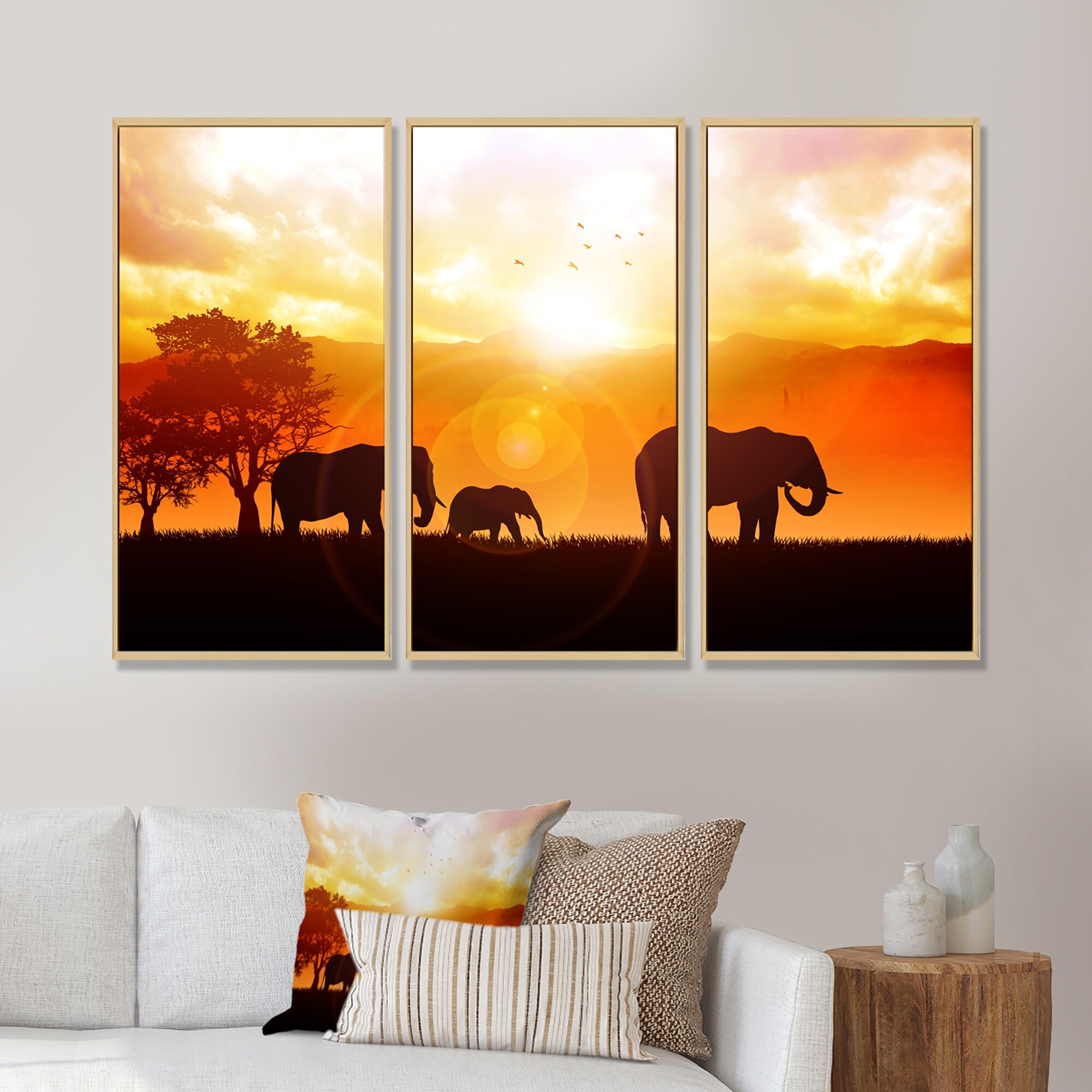 Designart "Elephants Walking At Sunset" Animal Framed Artwork Set of 3 - 4 Colors of Frames