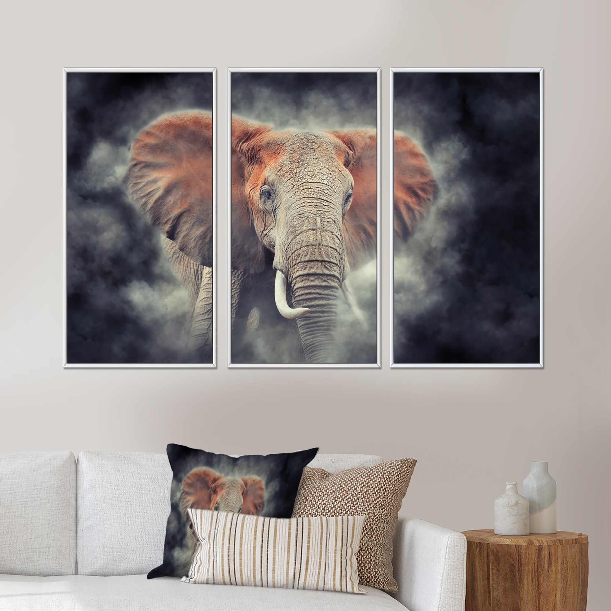 Designart "Elephant Closeup in smoke" Animal Framed Art Prints Set of 3 - 4 Colors of Frames