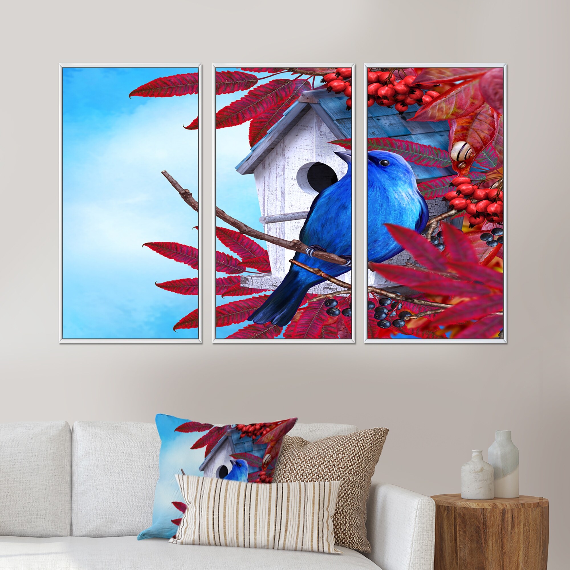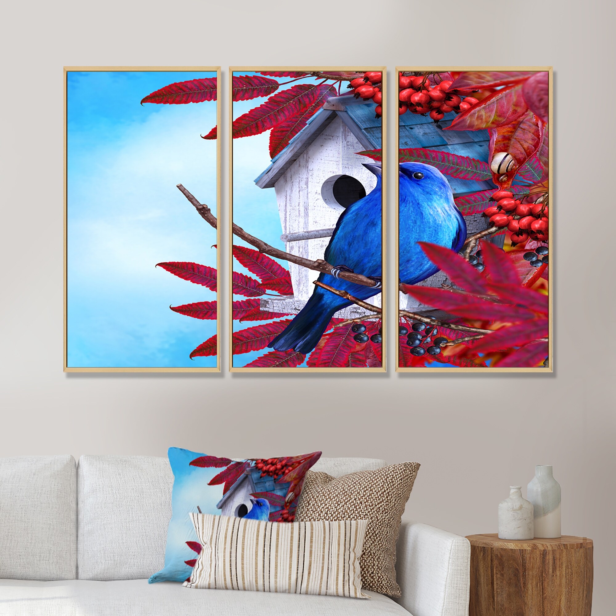 Designart "Little Blue Bird Sitting on Red Leaves Branch" Country Framed Wall Art Set of 3 - 4 Colors of Frames