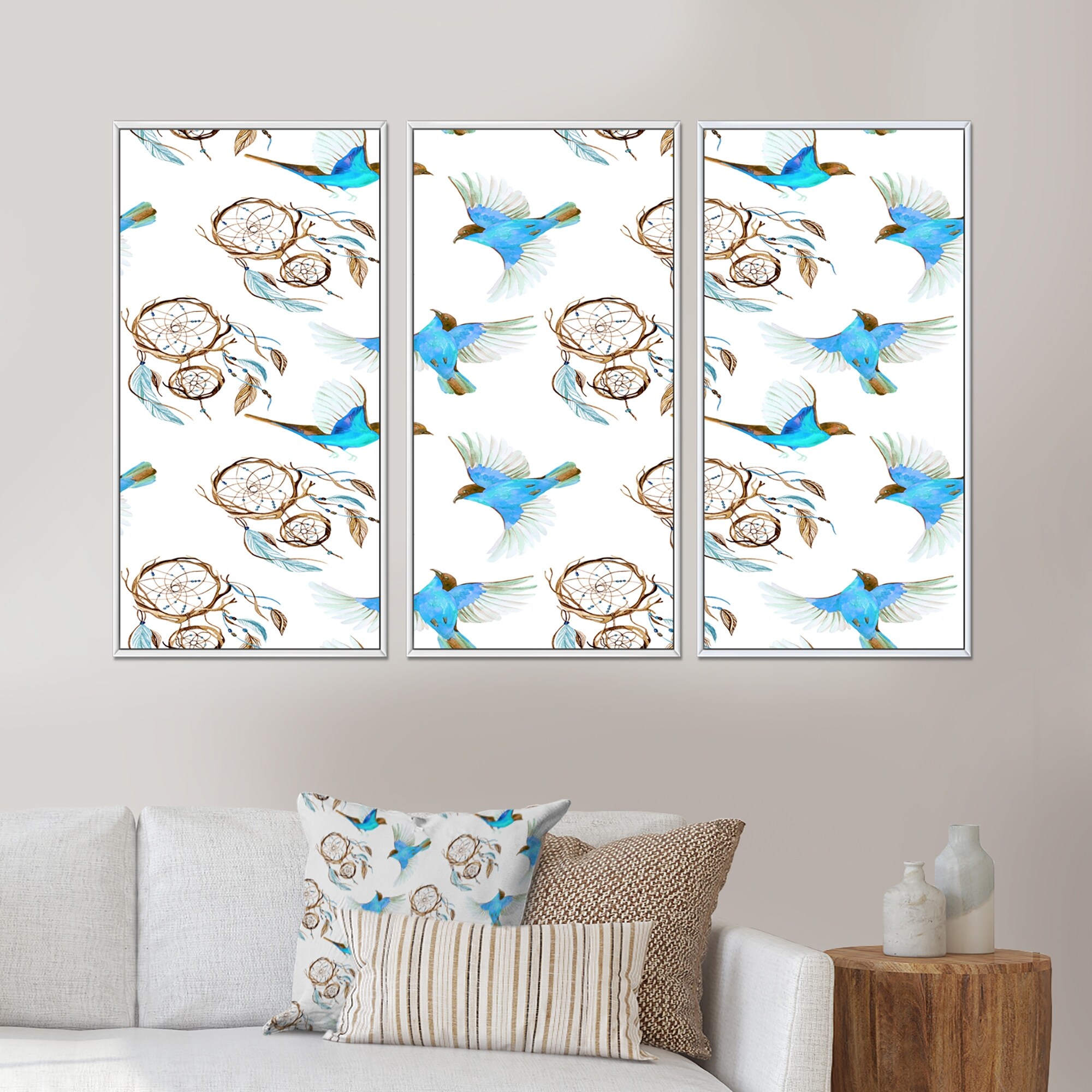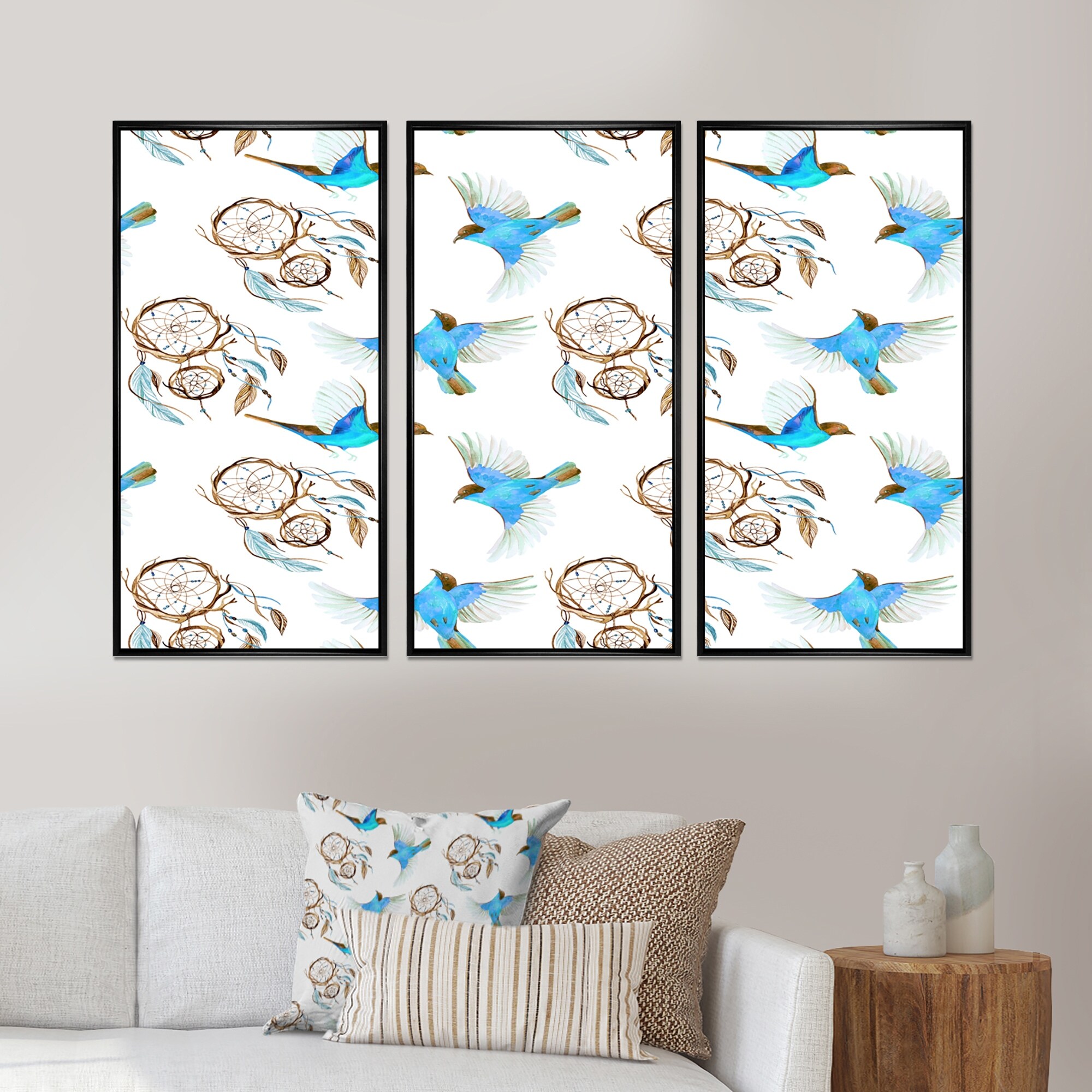 Designart "Ethnic Dreamcatchers With Little Blue Birds" Bohemian Framed Canvas Wall Art Set of 3 - 4 Colors of Frames