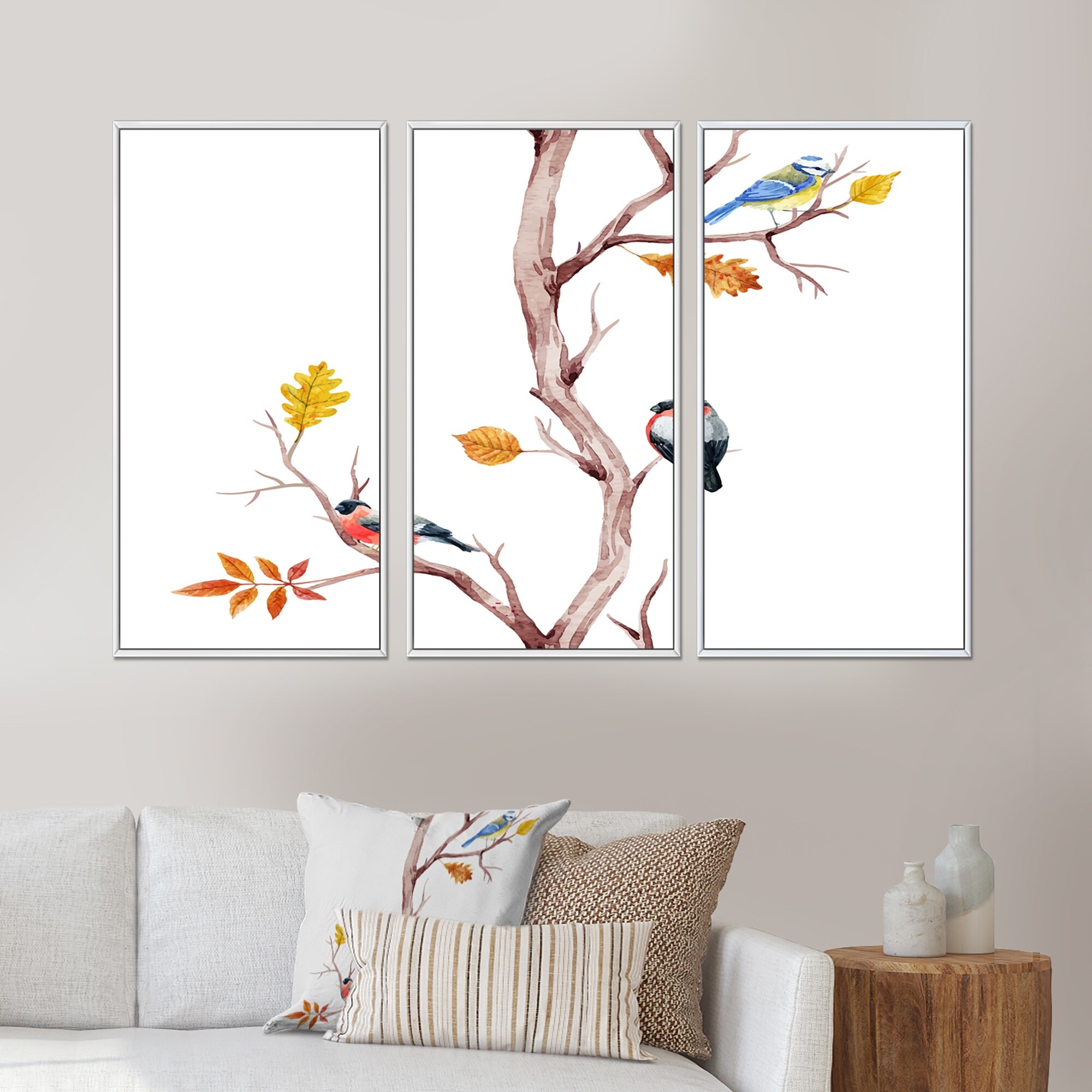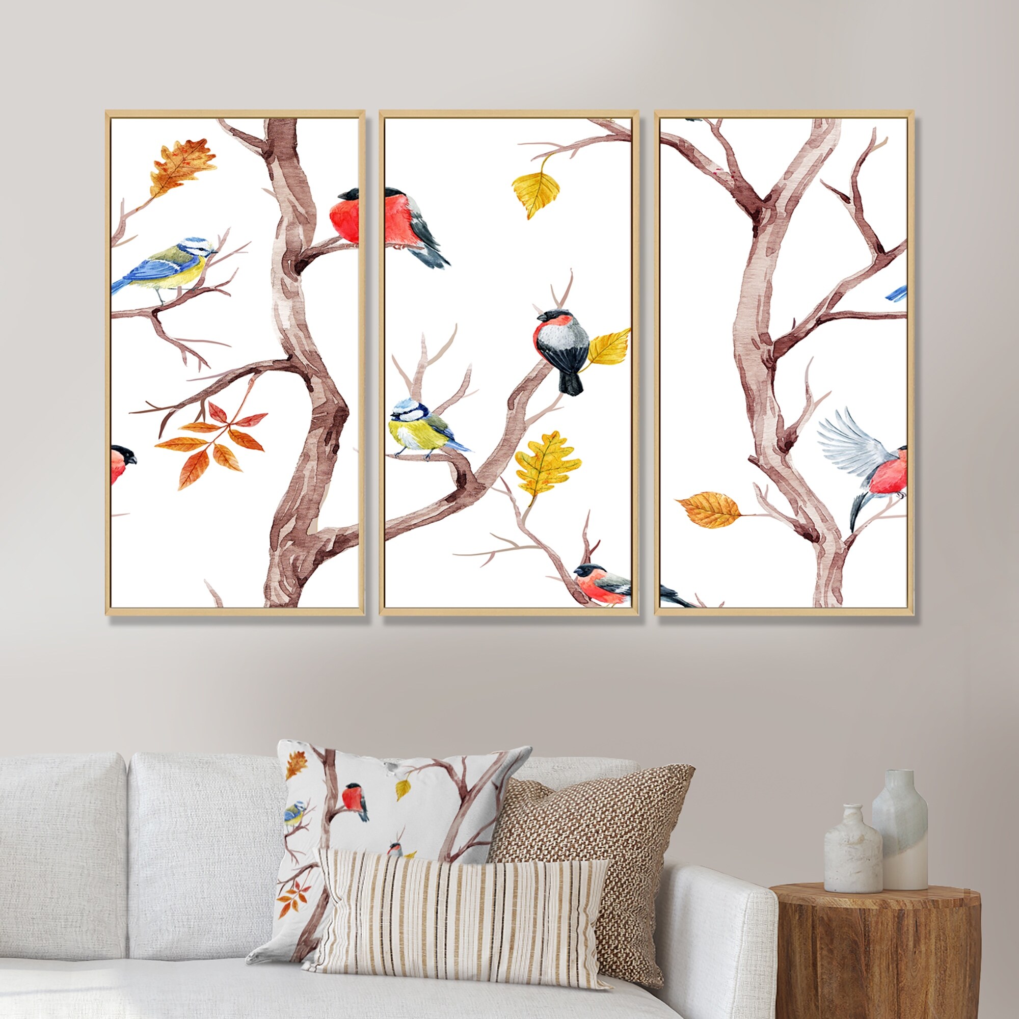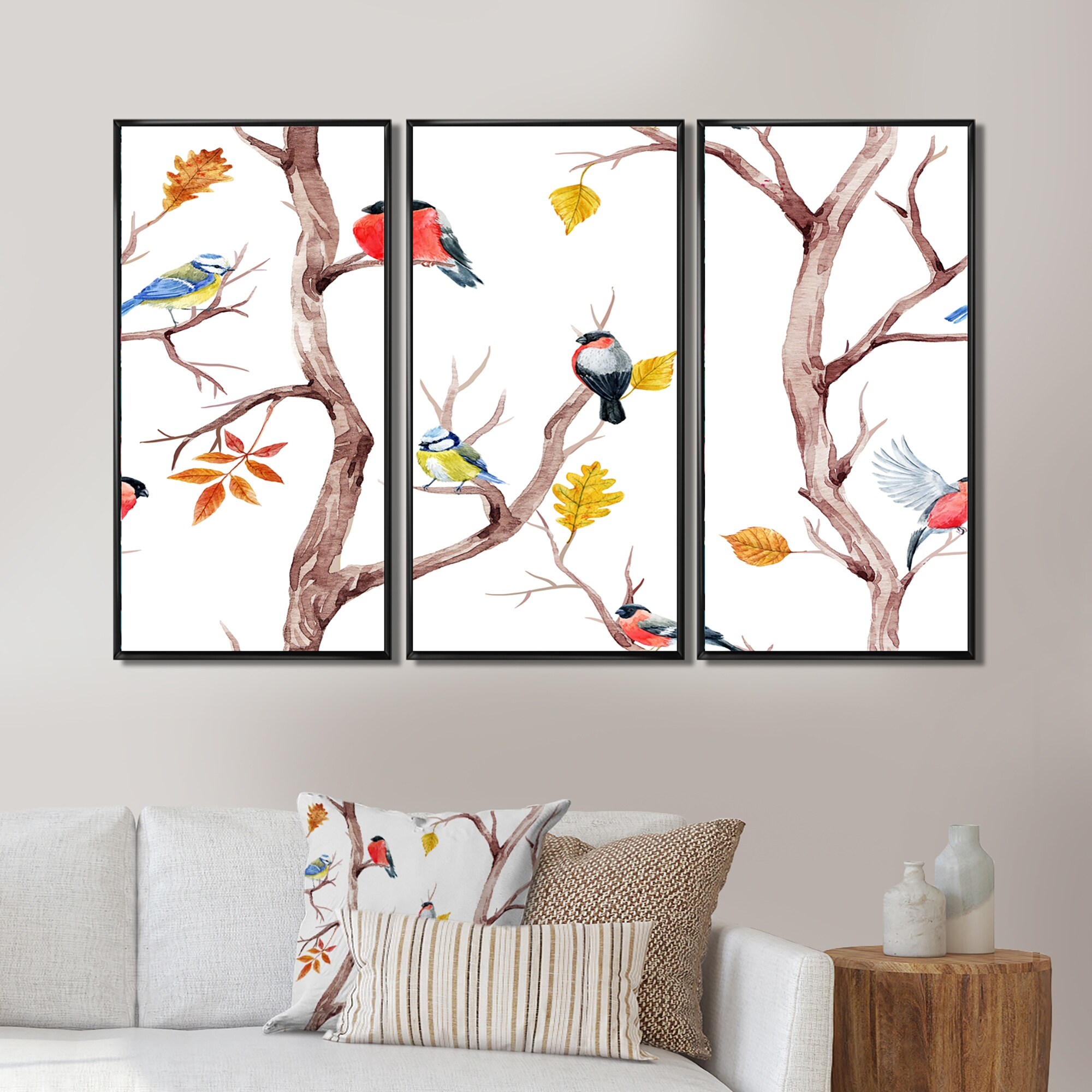 Designart "Fall Trees and Little Birds" Traditional Framed Canvas Wall Art Set of 3 - 4 Colors of Frames