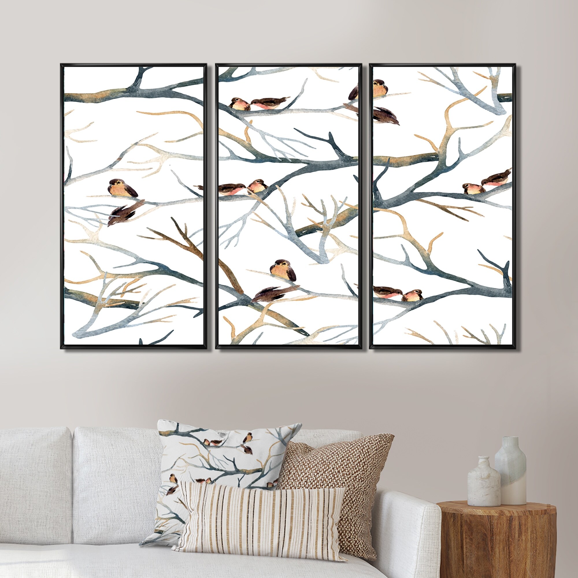 Designart "Little Birds on the Tree Branches IV" Traditional Framed Canvas Wall Art Set of 3 - 4 Colors of Frames