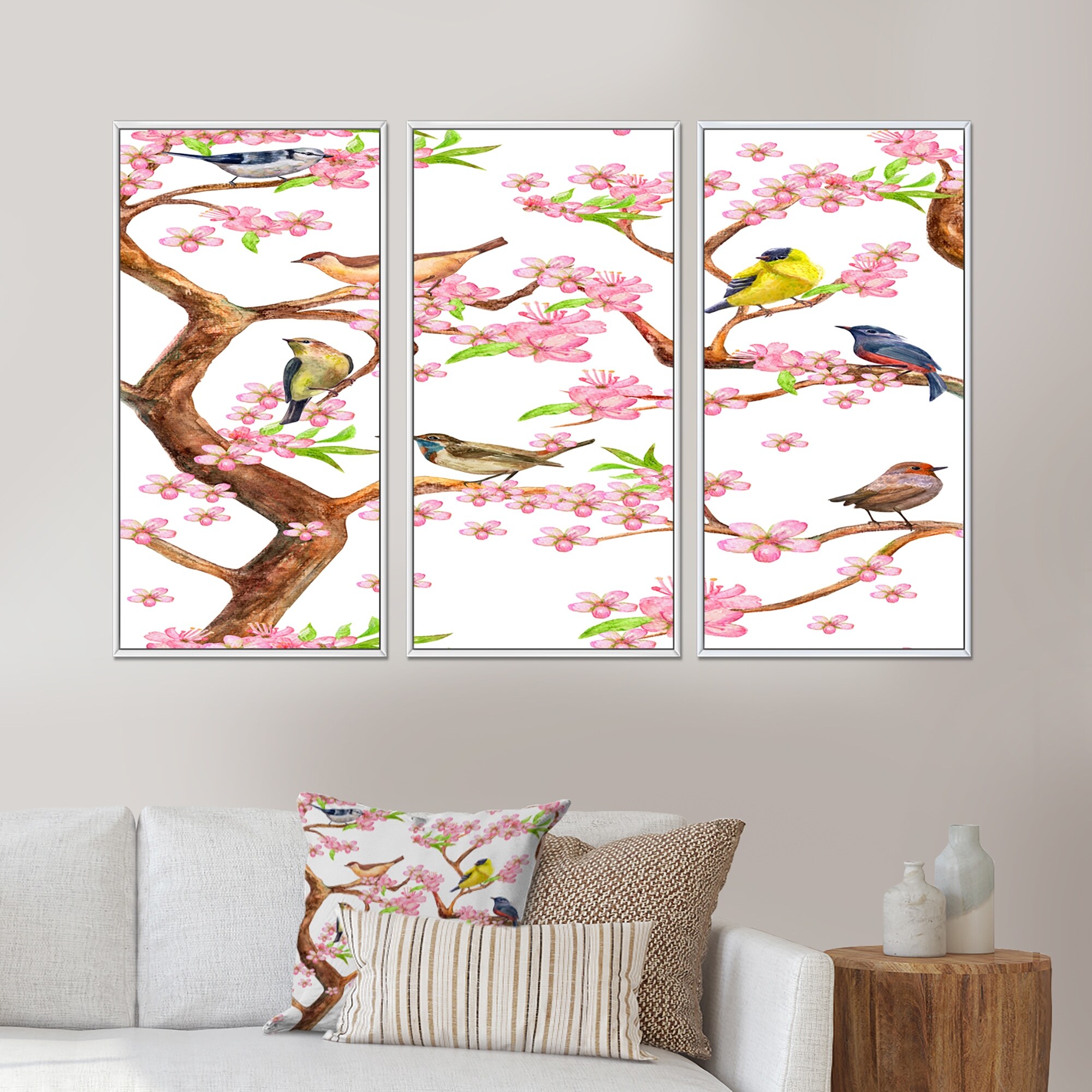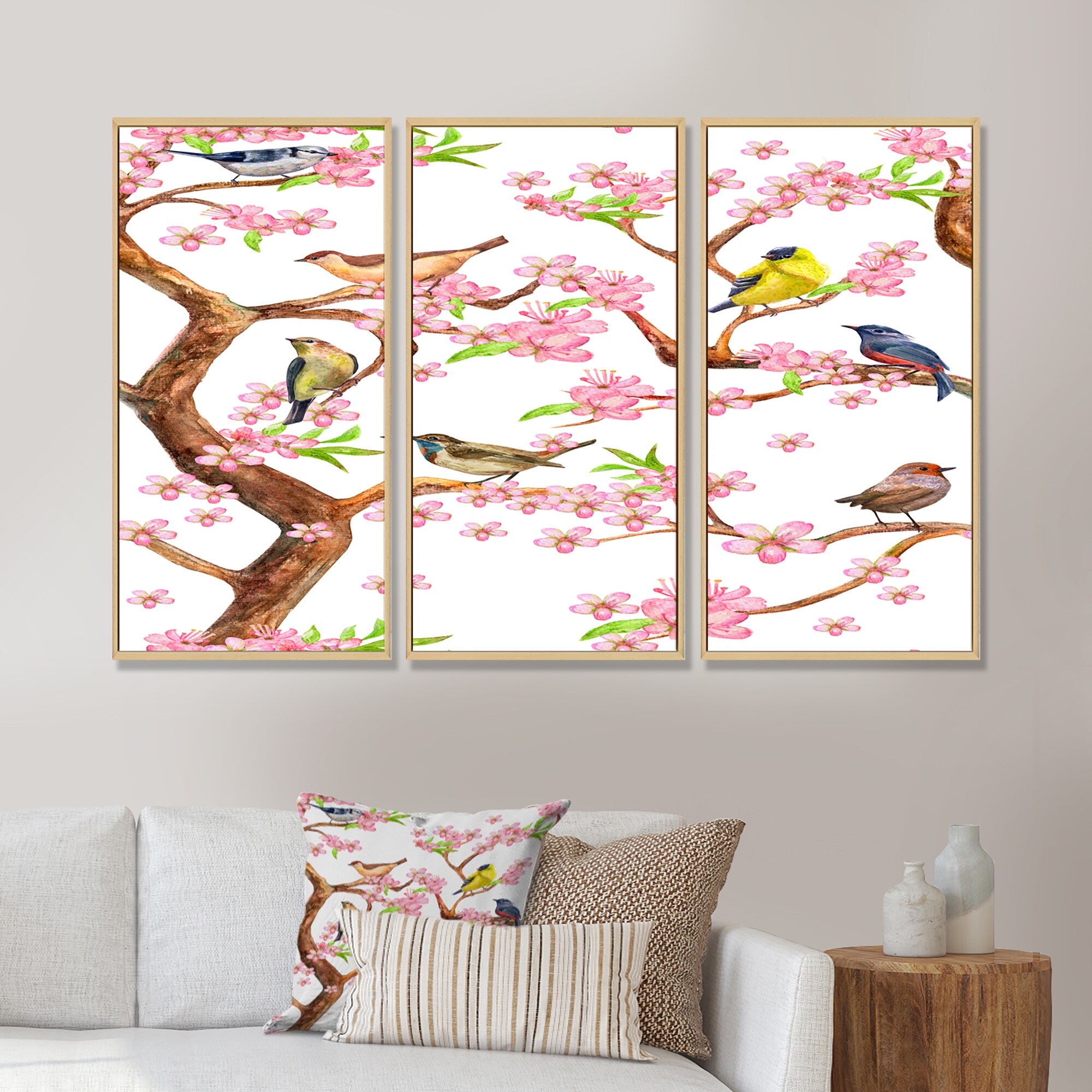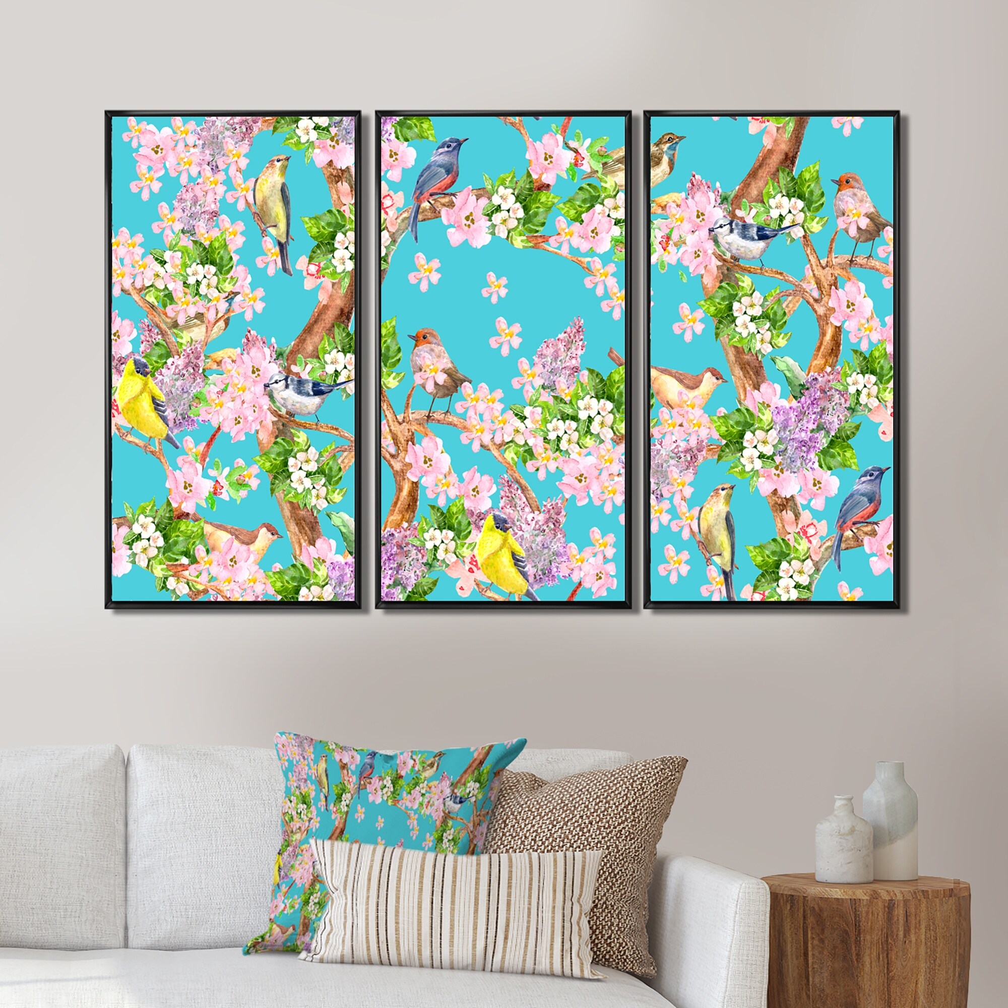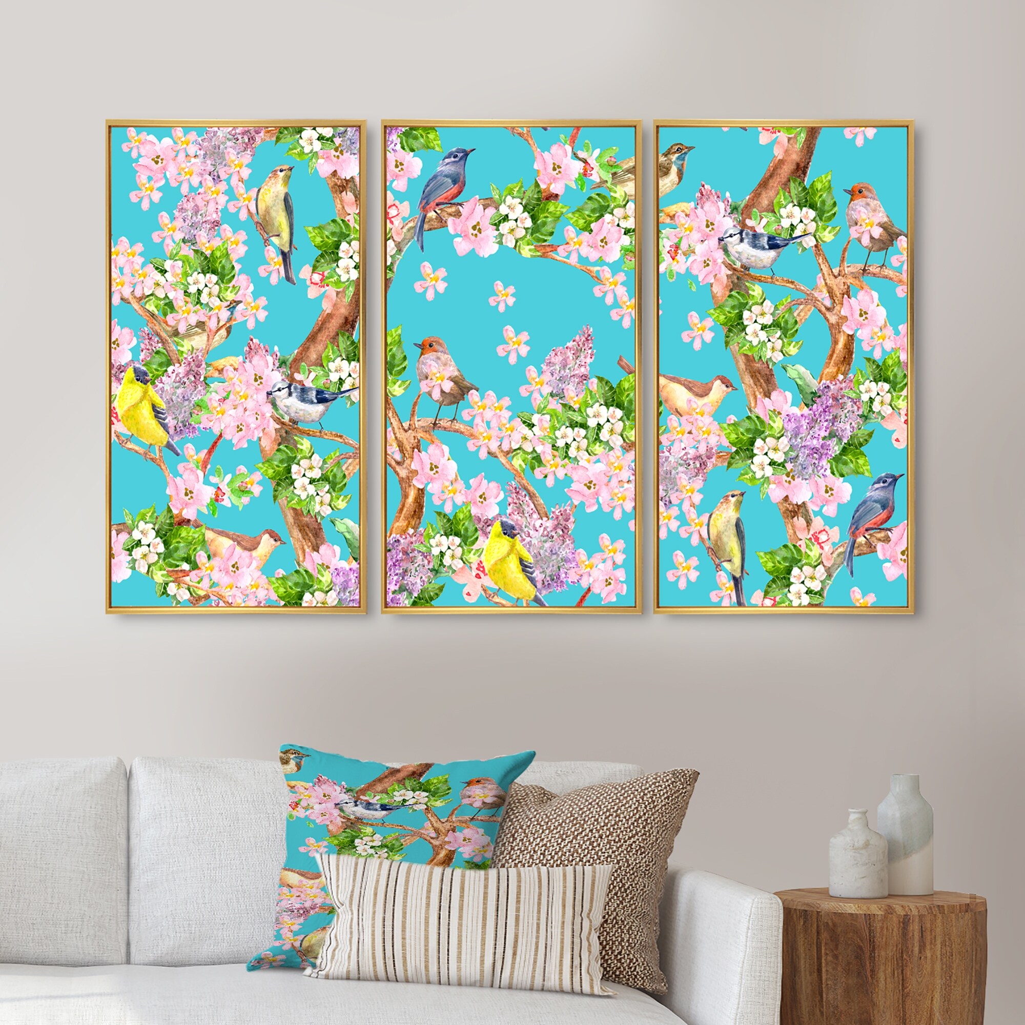 Designart "Little Birds Sitting on Spring Flow" Traditional Framed Wall Decor Set of 3 - 4 Colors of Frames