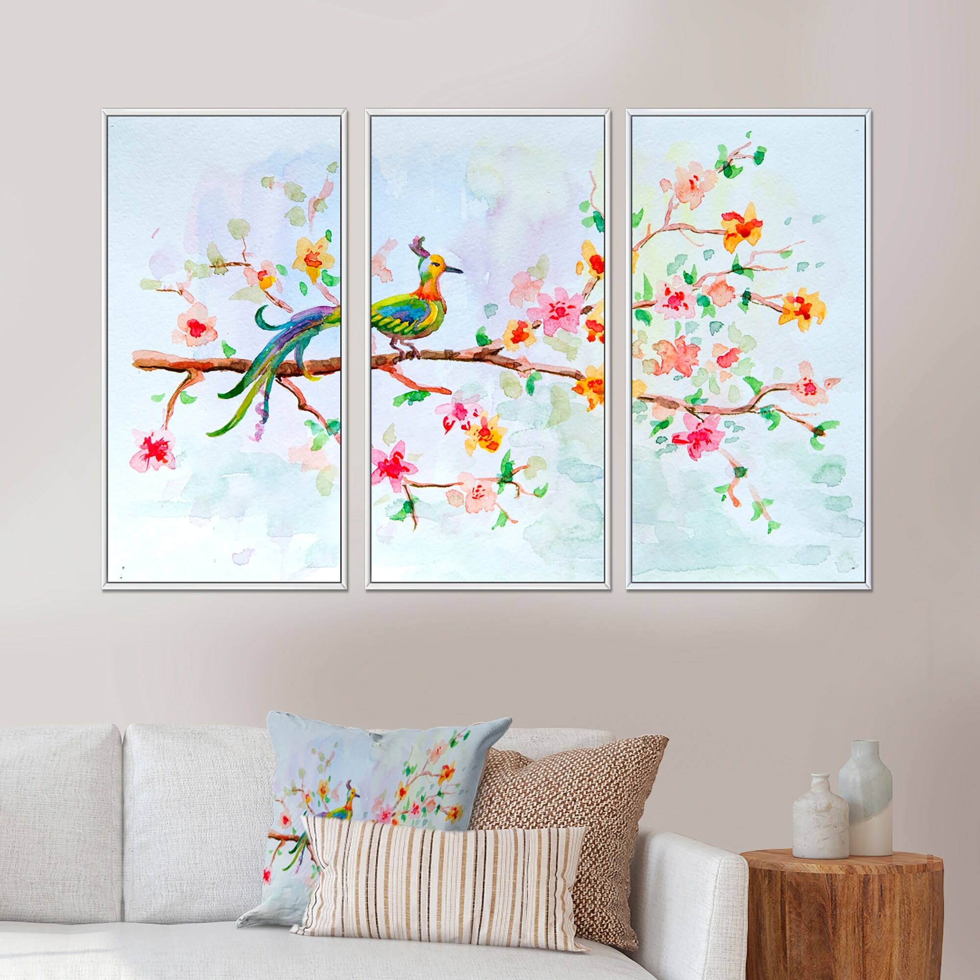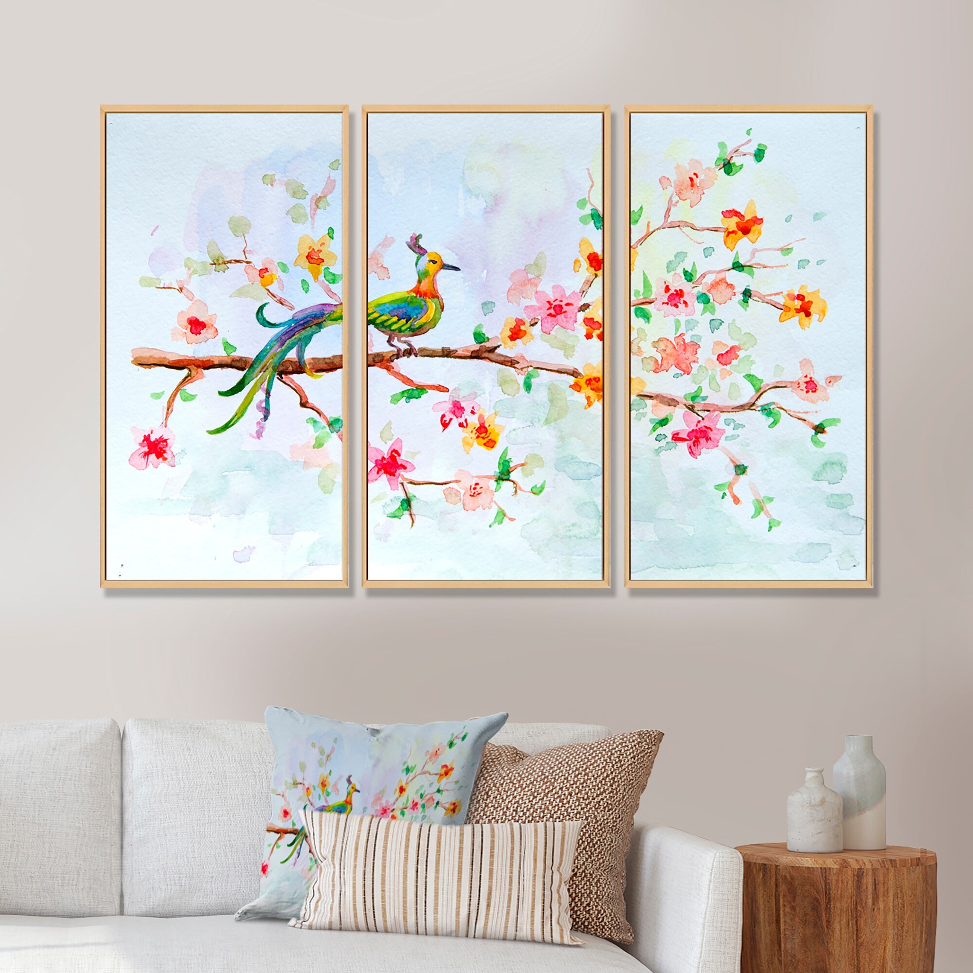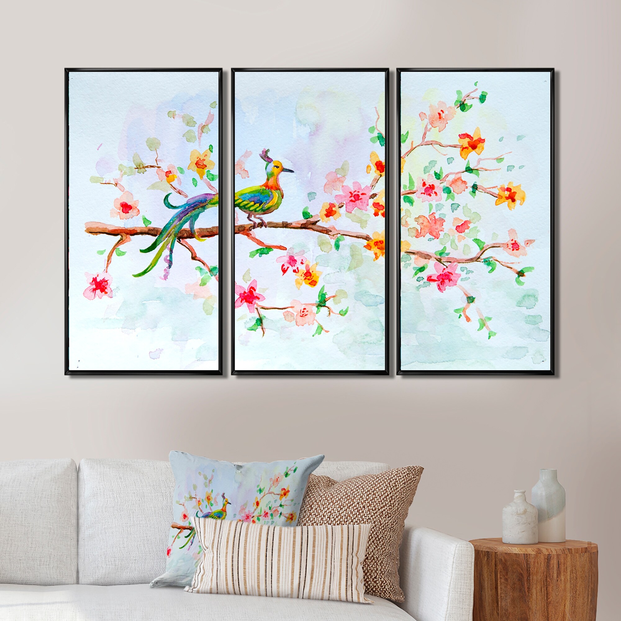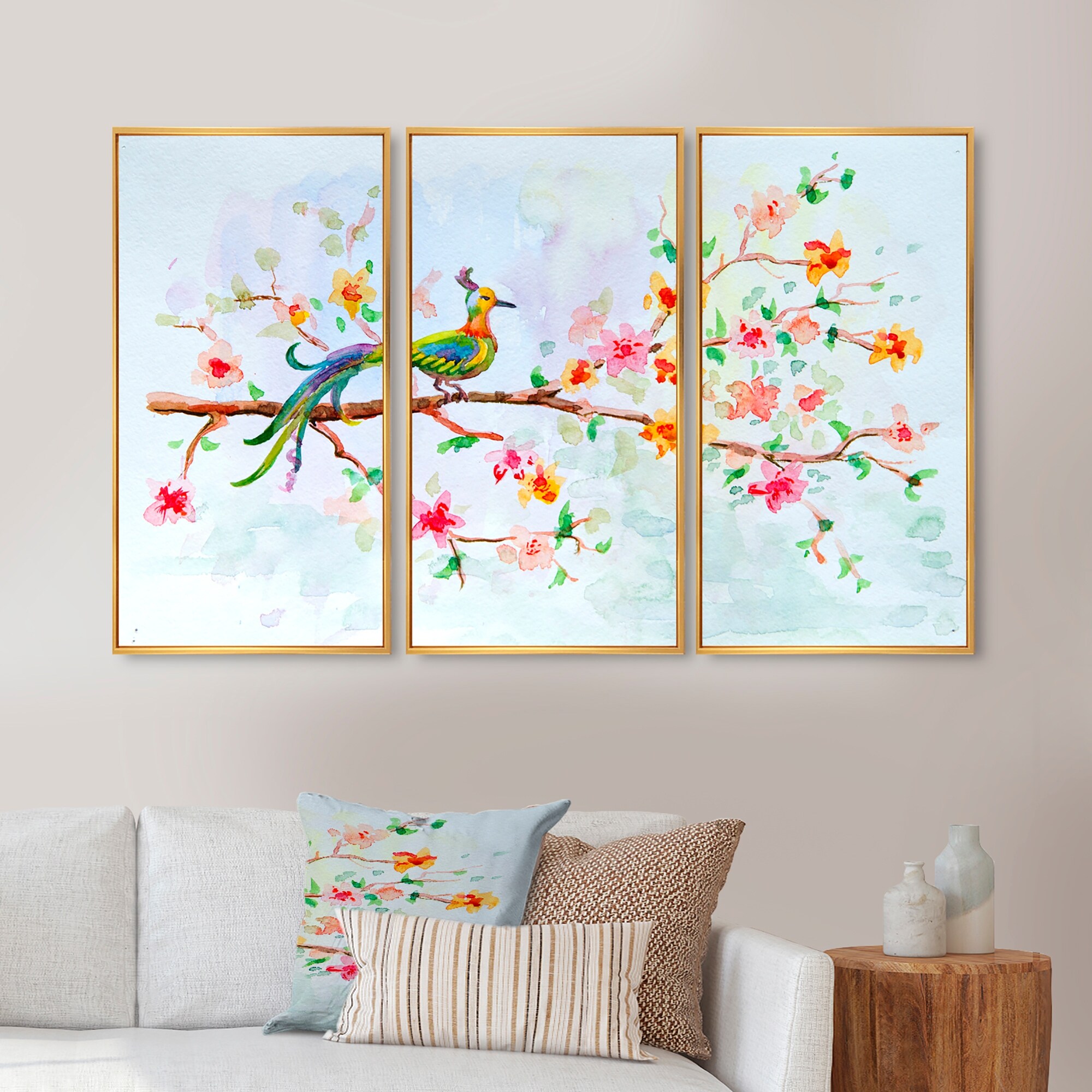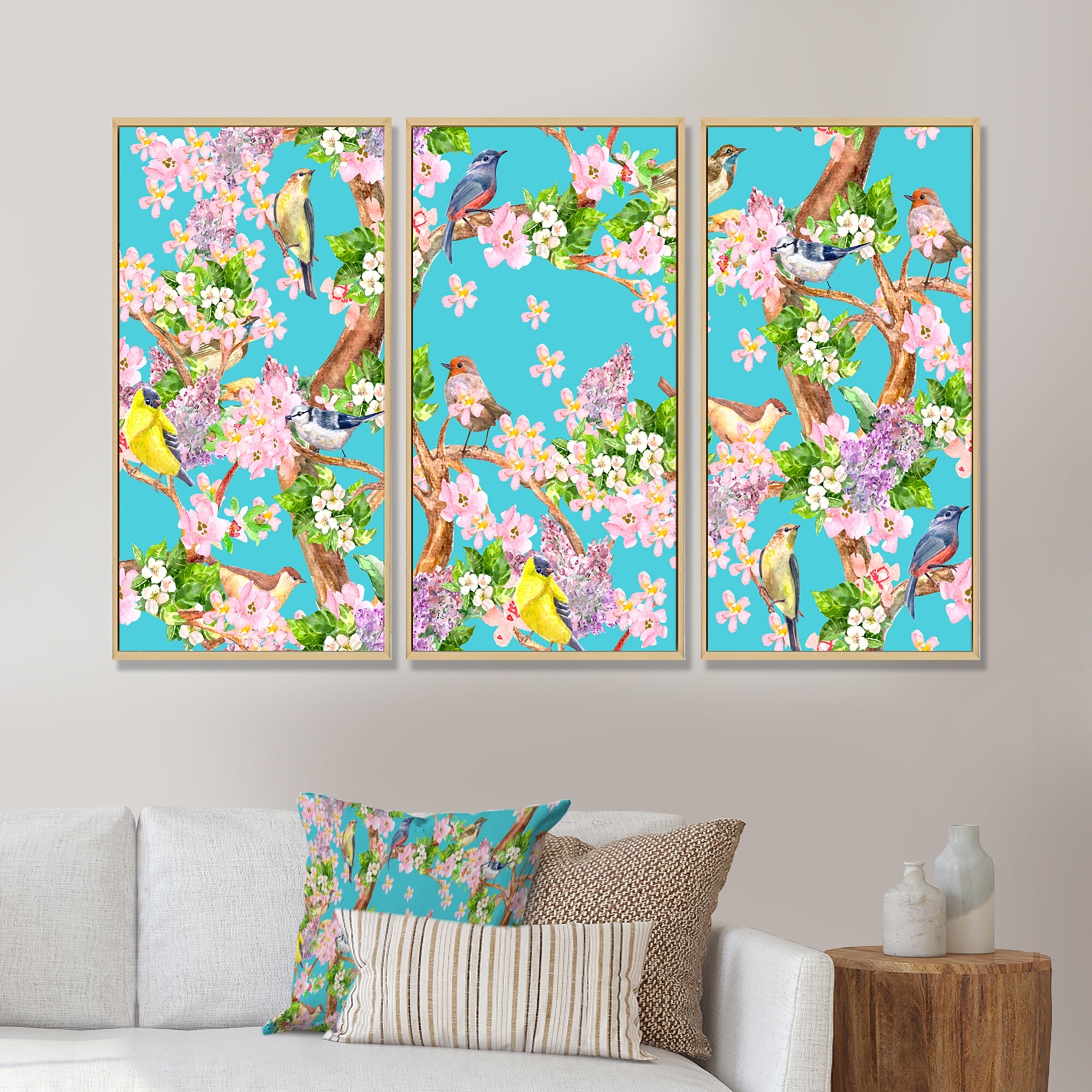 Designart "Little Birds Sitting on Spring Flow" Traditional Framed Wall Decor Set of 3 - 4 Colors of Frames