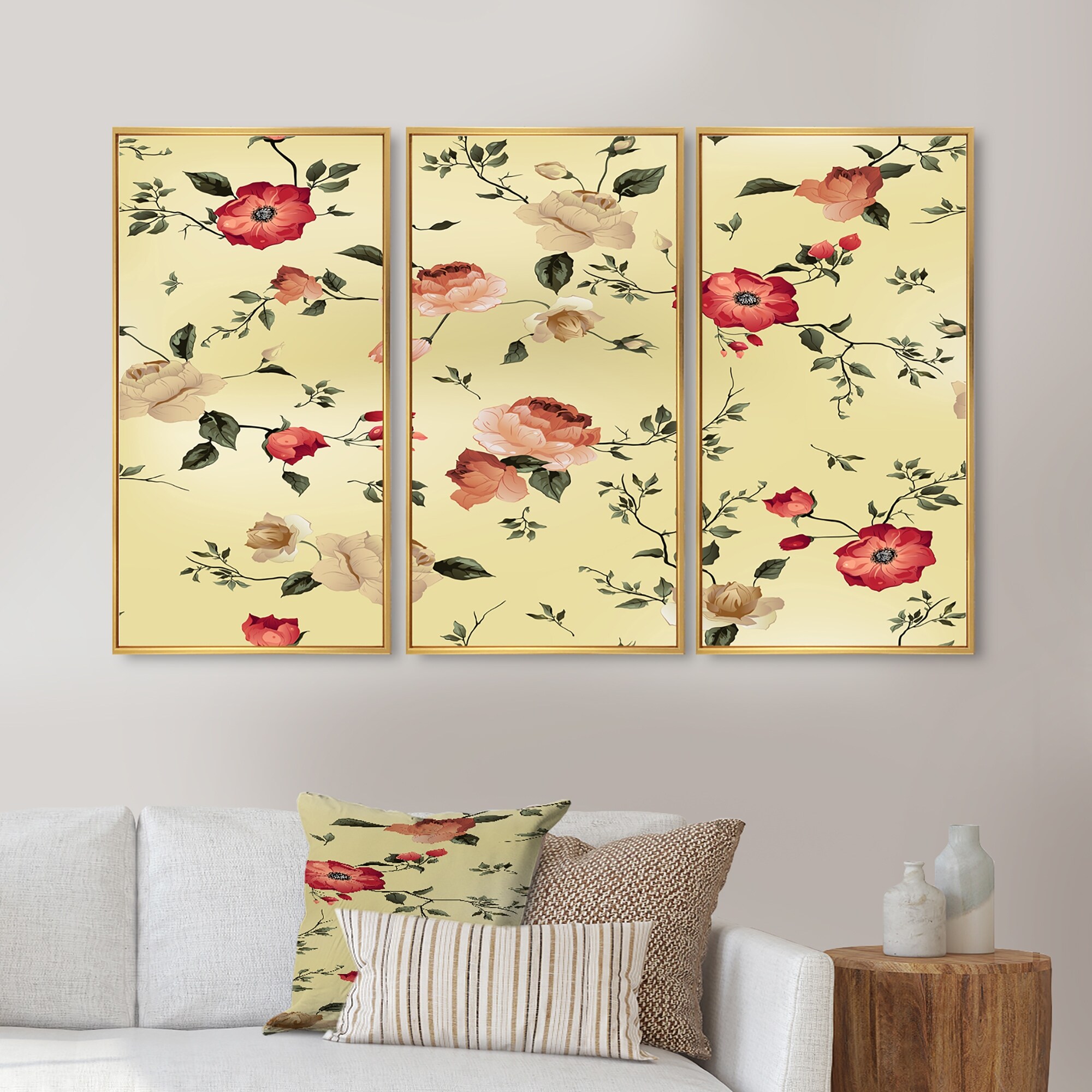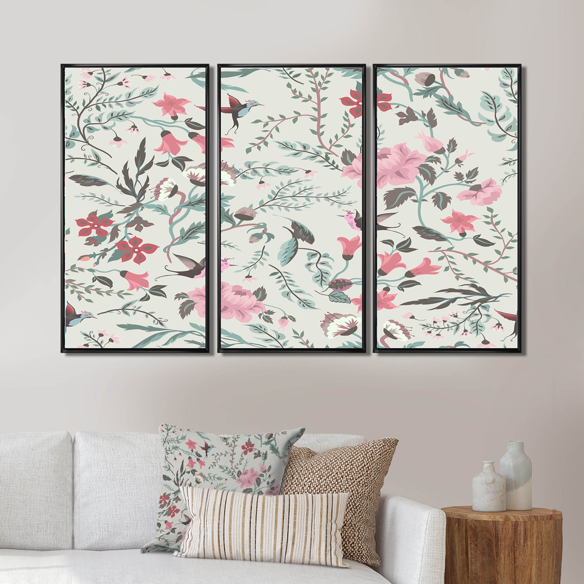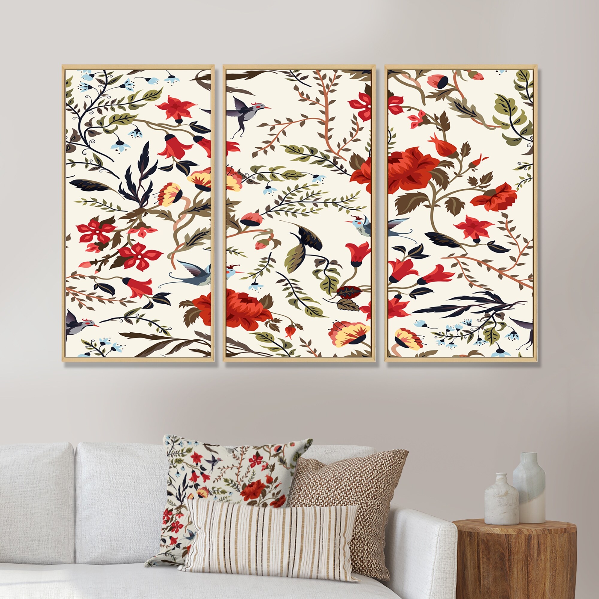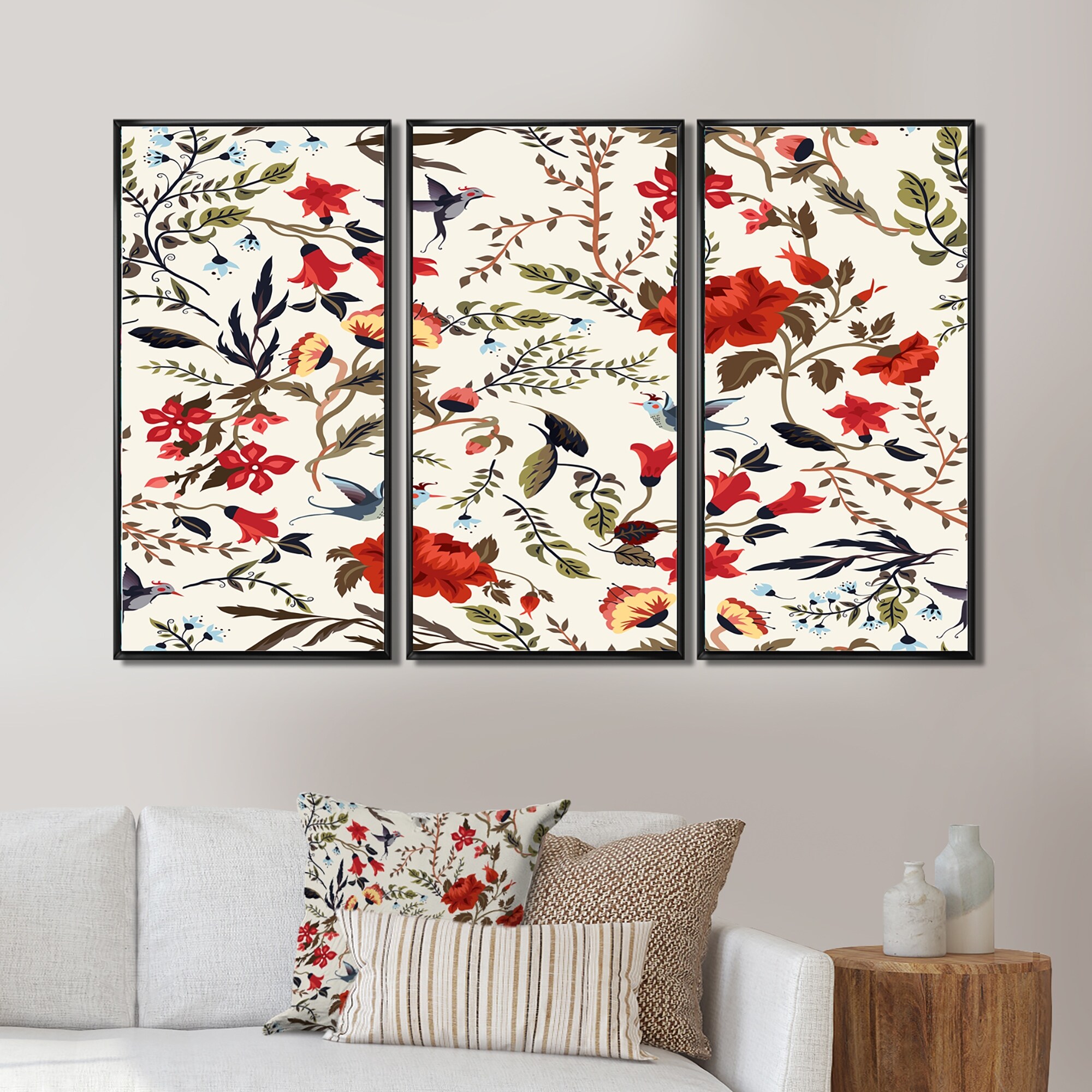 Designart "Vintage Roses And Little Birds I" Traditional Framed Canvas Wall Art Print Set of 3 - 4 Colors of Frames