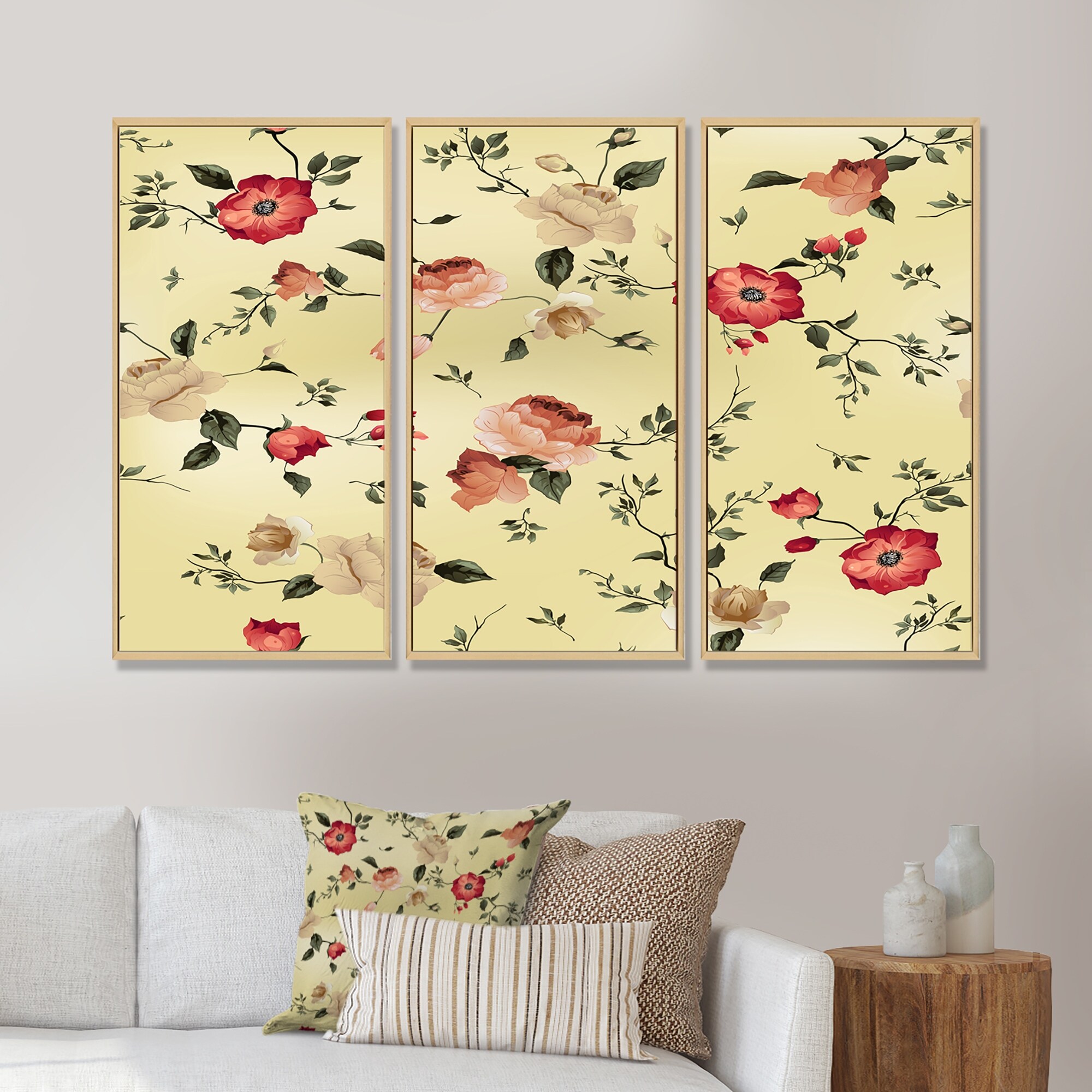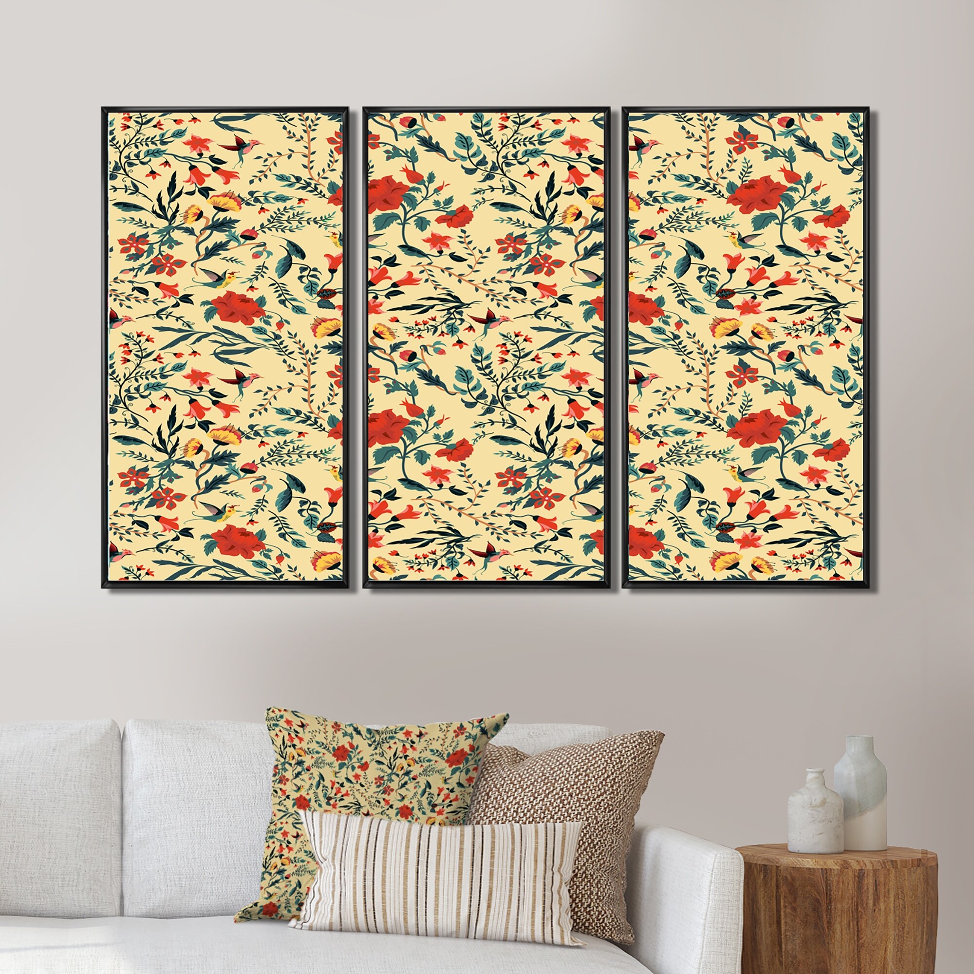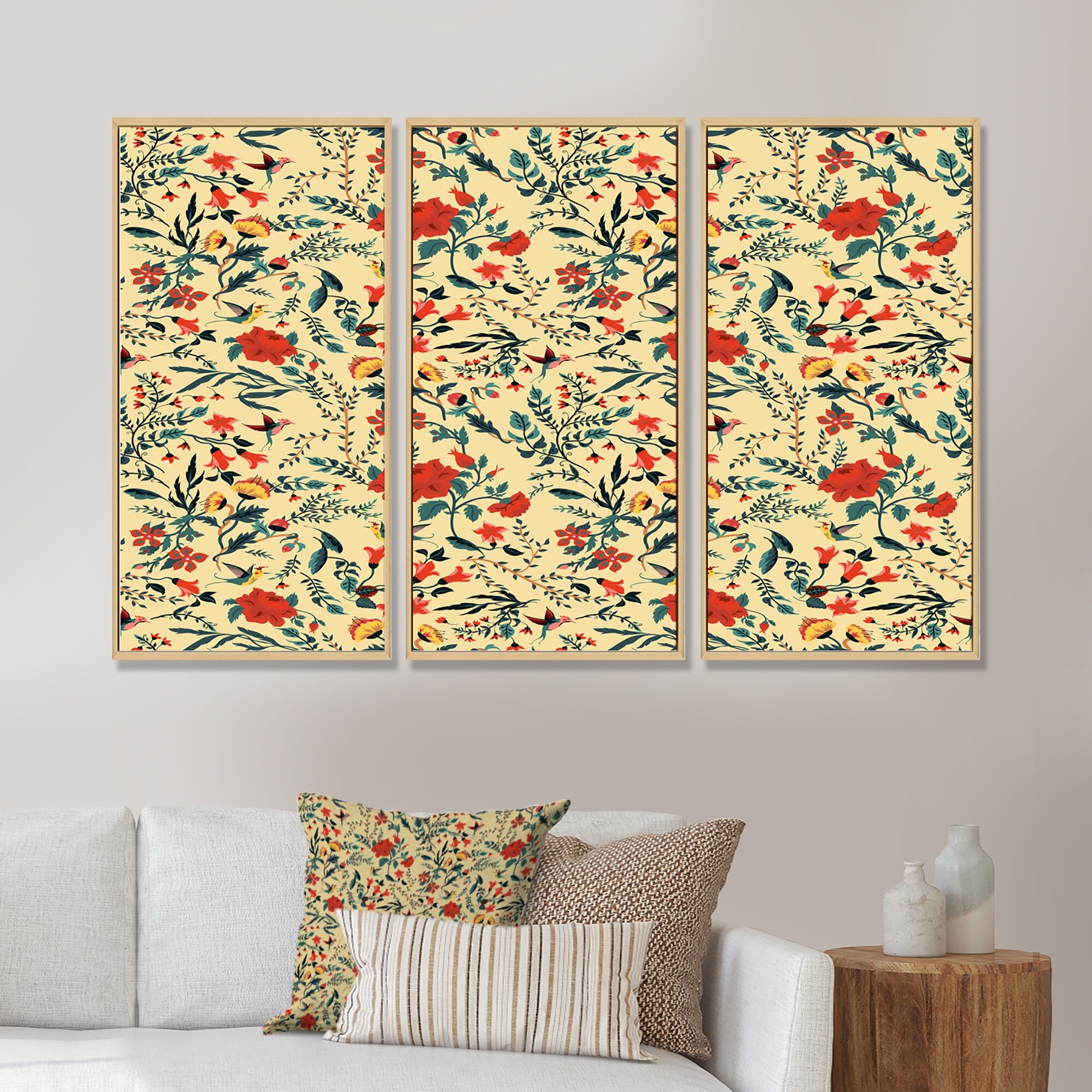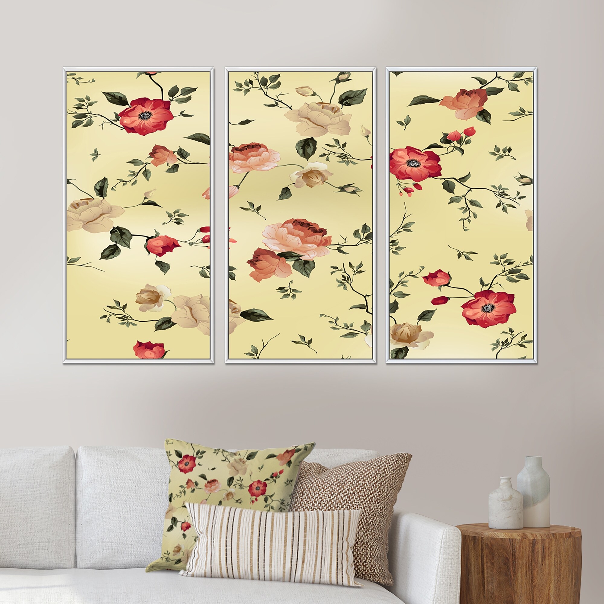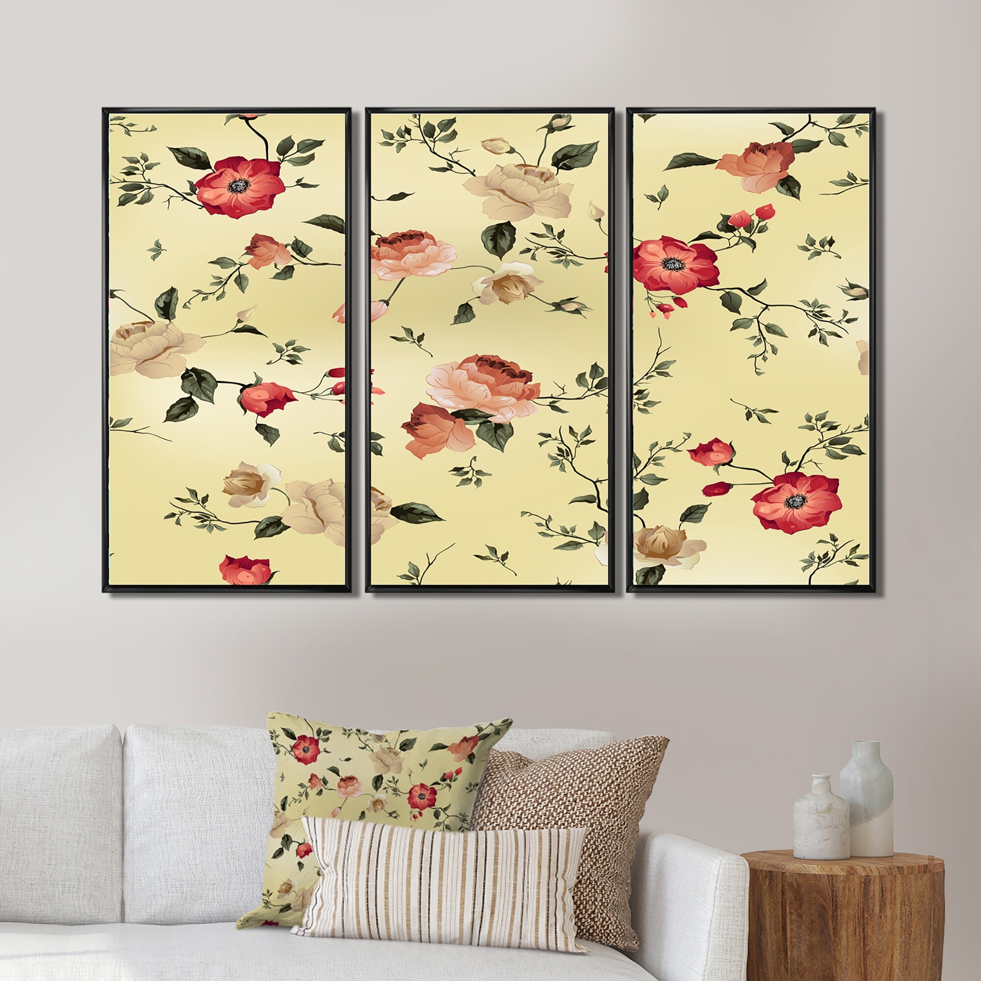 Designart "Vintage Roses And Little Birds I" Traditional Framed Canvas Wall Art Print Set of 3 - 4 Colors of Frames