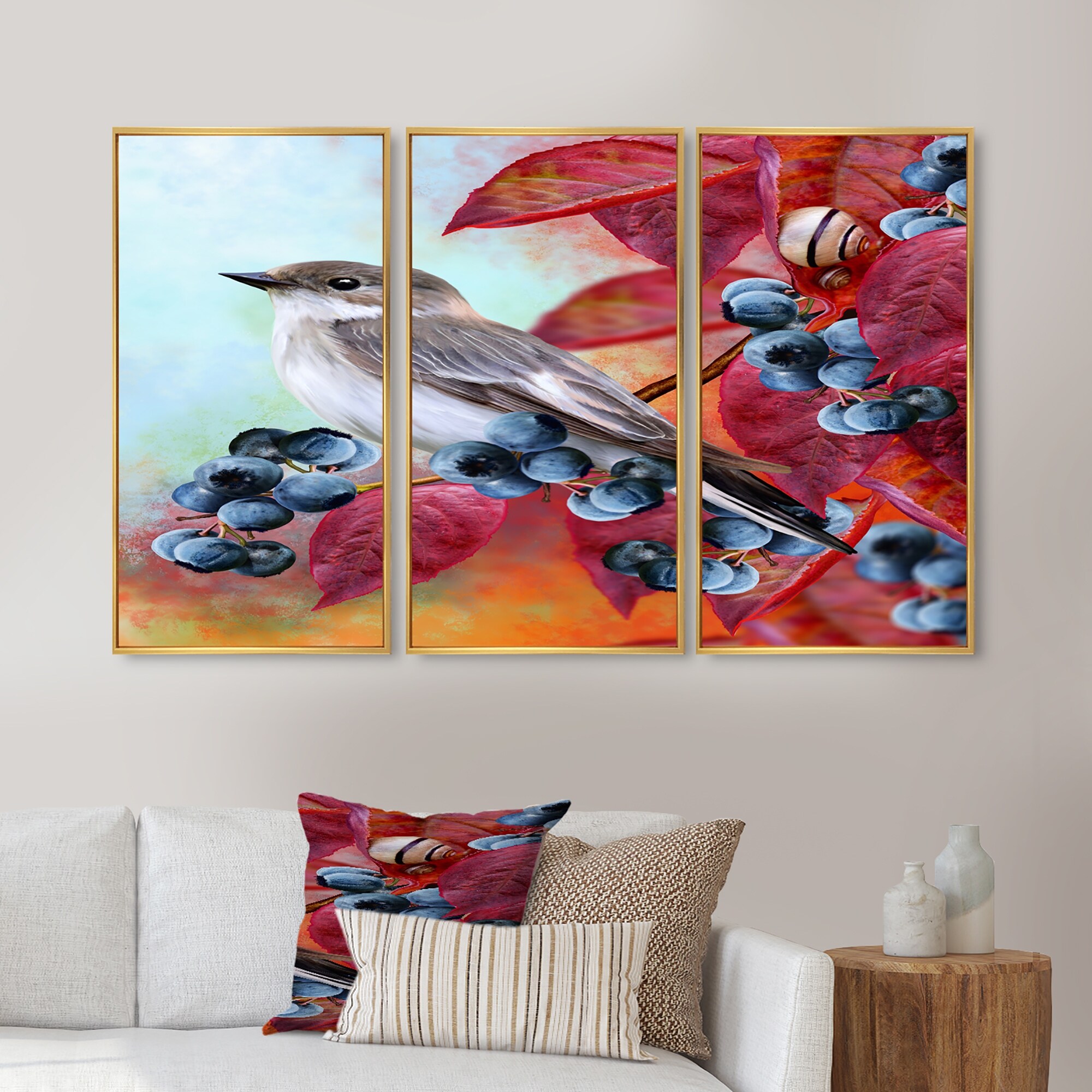 Designart "Little Gray Bird on Red Autumn on Blueberry Twig" Traditional Framed Wall Decor Set of 3 - 4 Colors of Frames