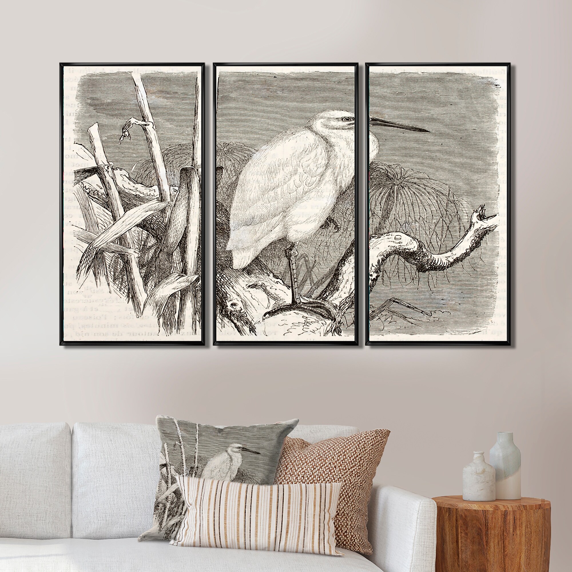 Designart "Little Egret Bird" Farmhouse Framed Canvas Wall Art Print Set of 3 - 4 Colors of Frames