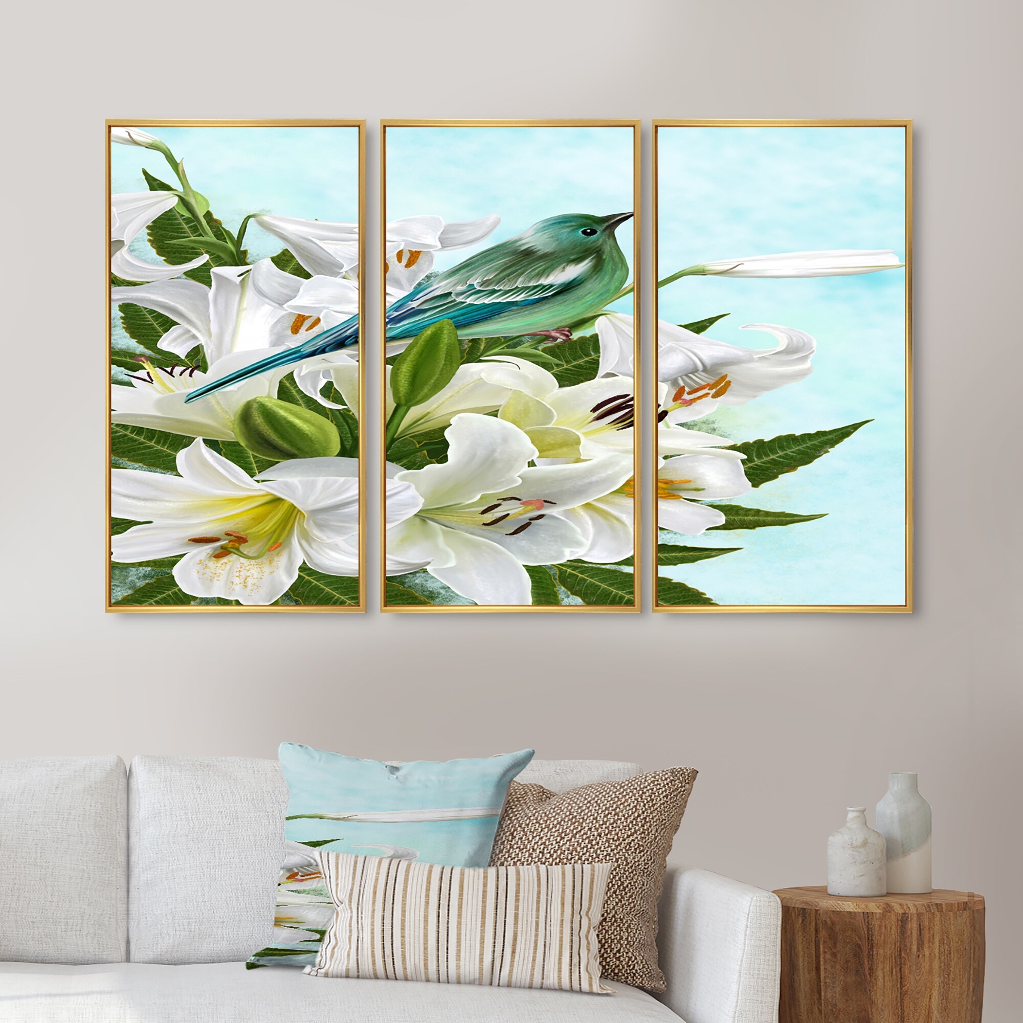 Designart "Little Blue Bird With White Flowers Lilies" Cabin & Lodge Framed Wall Decor Set of 3 - 4 Colors of Frames