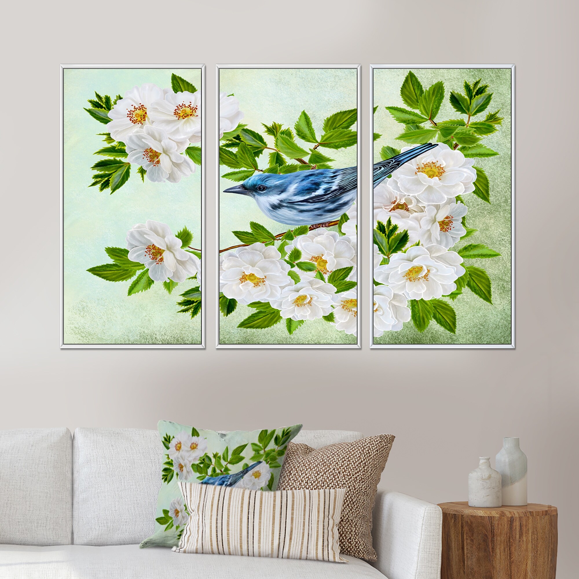 Designart "Little Blue Bird Sitting on A Branch of White Rose" Traditional Framed Canvas Wall Art Print - 3 Panels