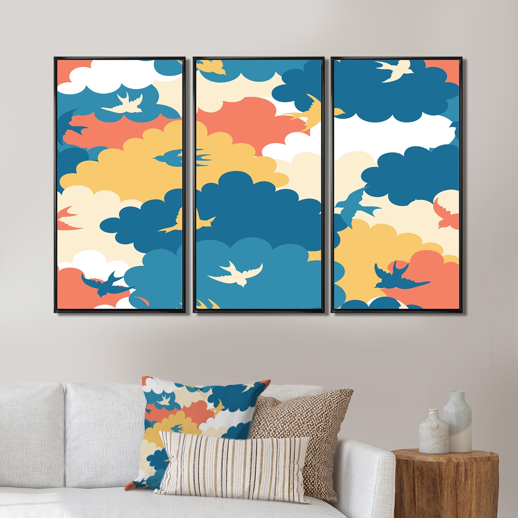 Designart "Red Blue And Yellow Clouds With Little Birds" Patterned Framed Canvas Wall Art Print Set of 3 - 4 Colors of Frames